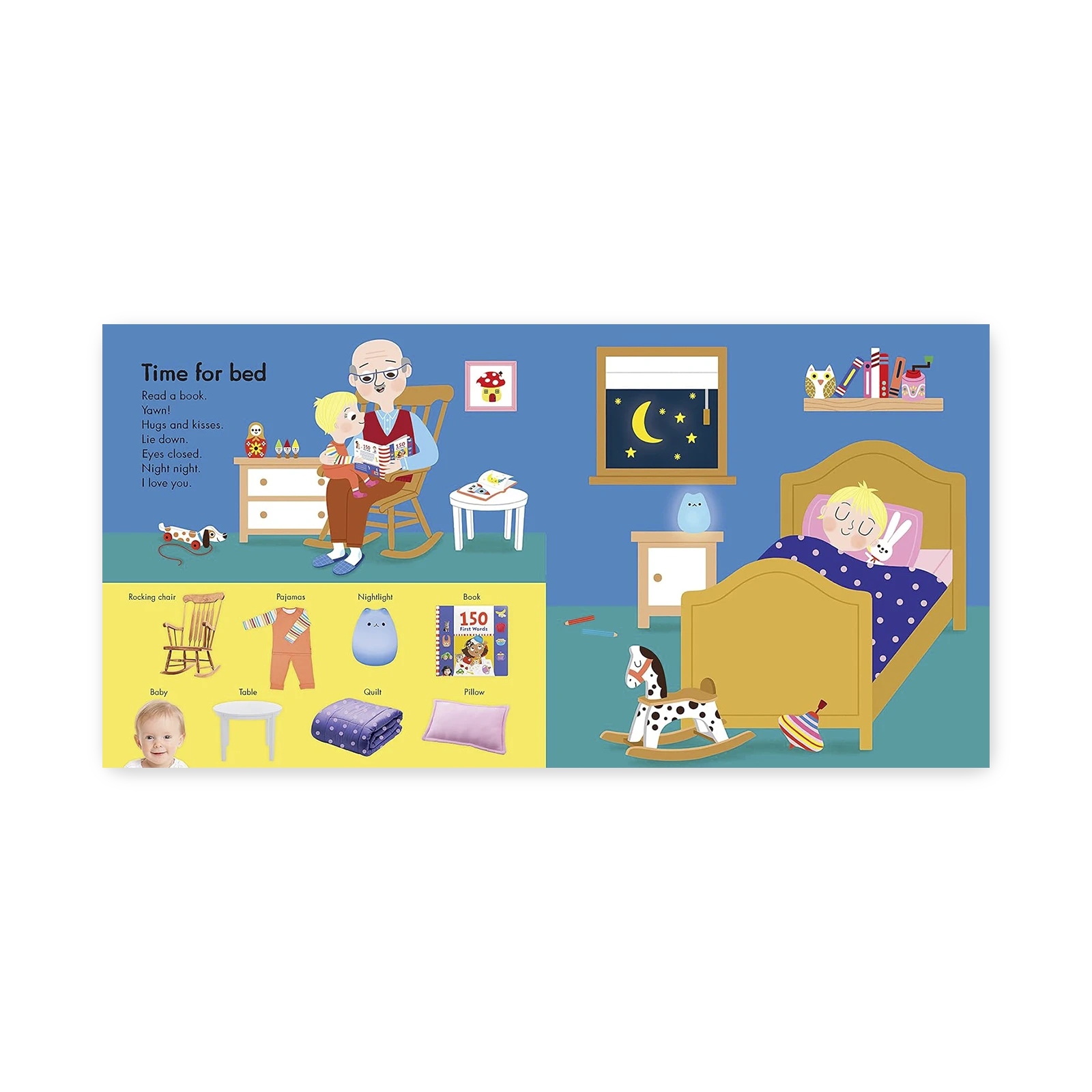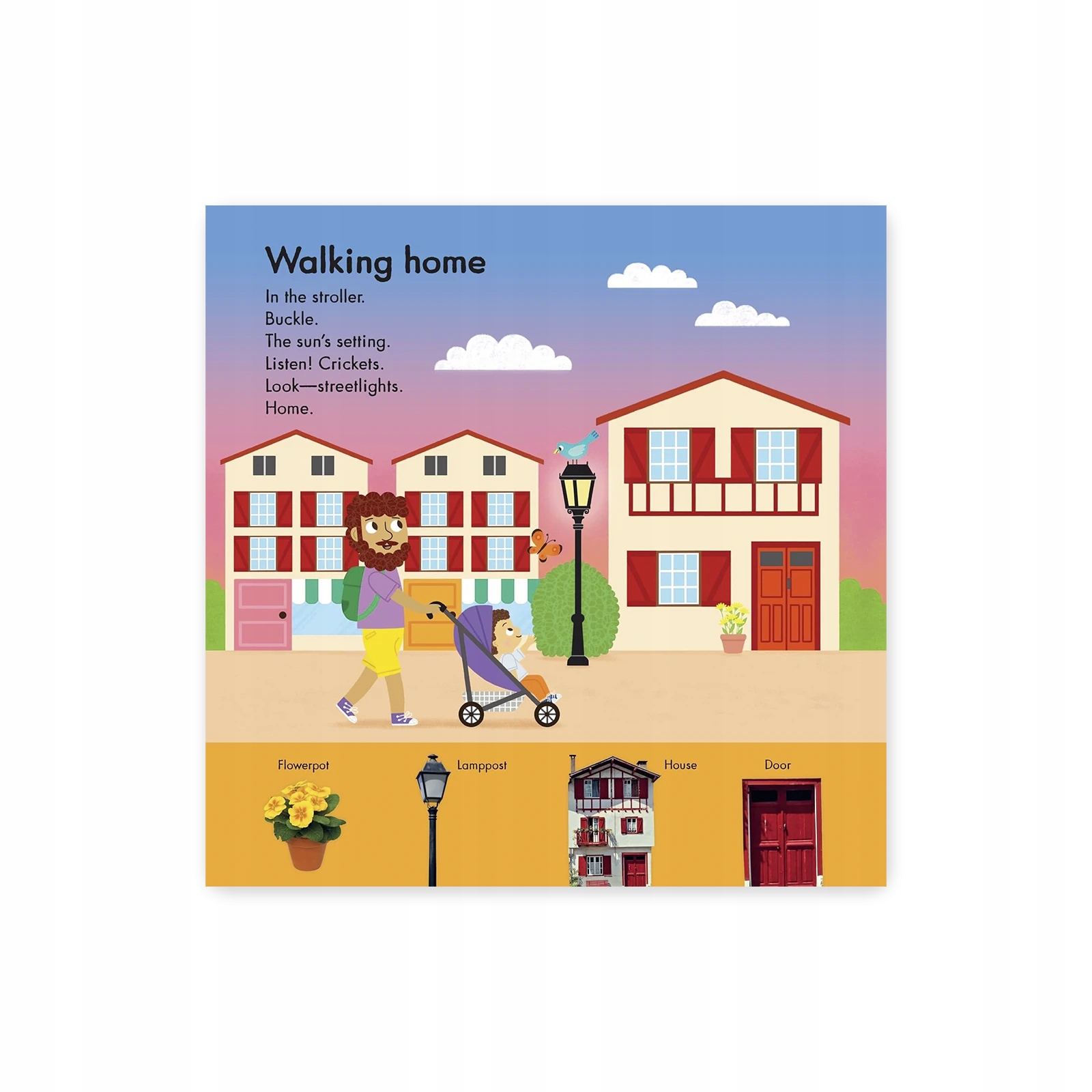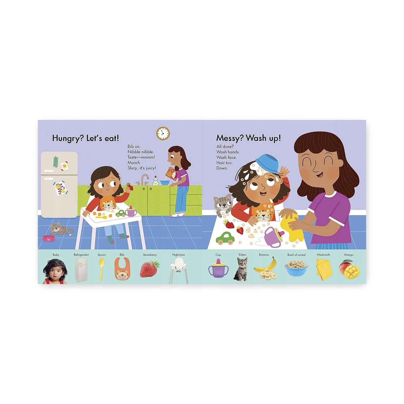 Цей захоплюючий настільний посібник великого формату заохочує малюків вивчати мову шляхом повторення простих слів і фраз для повсякденних предметів і дій. Кожен ілюстрований розворот також містить фотографії немовлят і предметів повсякденного вжитку, намальовані в мистецтві, створюючи пошук і знахідку на кожній сторінці, щоб мати більше часу для спілкування батьків і дітей.