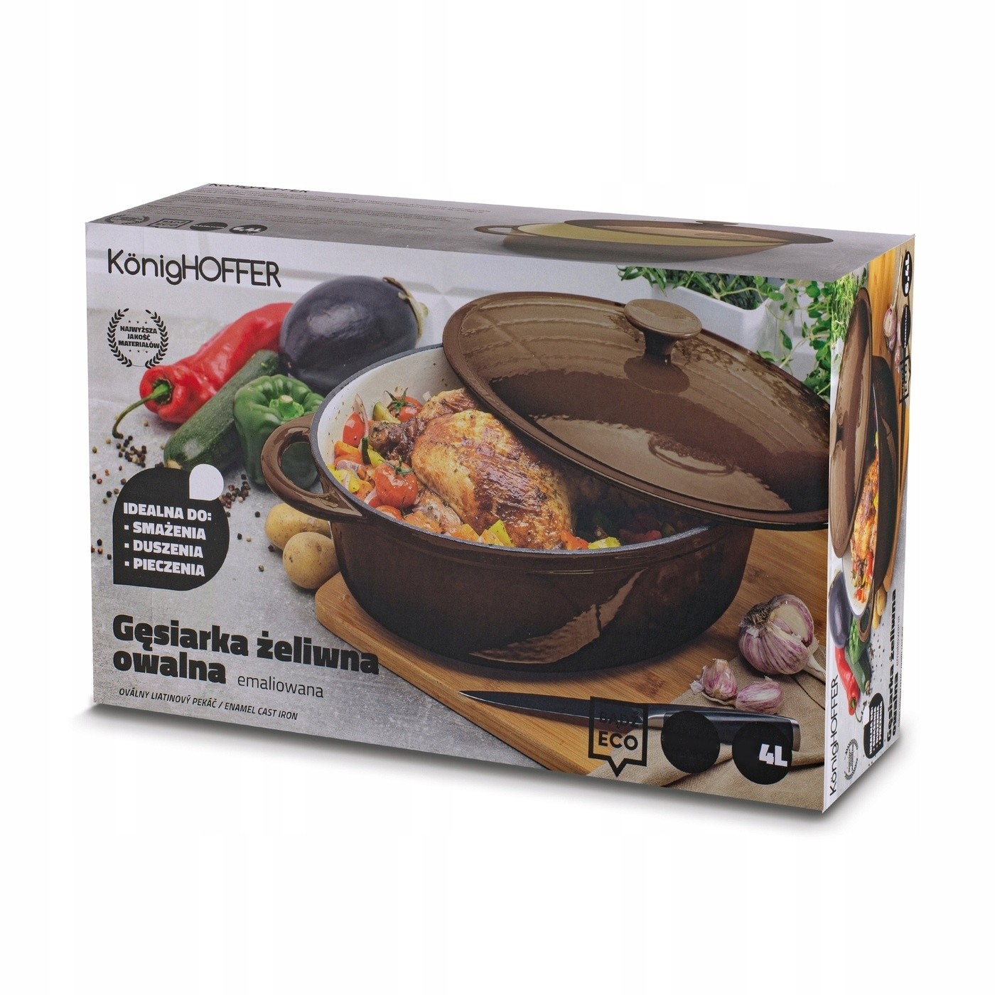 чавун -рон -ронний гусак є овальним, важким і твердим. Ви можете готувати, тушкувати, смажити і запікати посуд в ньому. Використовуючи посудину в духовці, не перевищуйте 250 градусів С. Однак продукт дозволяє вам нагрівати посуд годинами, тому це чудово, наприклад, для випічки птиці в повному обсязі (наприклад, качки). Завдяки чавунній кришці, прикріпленій до набору, ви можете відрегулювати кількість пари всередині гусака. Модель має класичний вигляд і може підкреслити знайомий персонаж та затишний декор вашої кухні. Ви навіть випікаєте традиційний хліб із закваски. Розміри сірого гусака становить 26 х 21 х 11,2 см. Продукт має рекомендацію Ewa Wachowicz. Як посол Konighoffer, вона рекомендує його для домашнього використання з посмішкою. Ви отримаєте з ним свій домашній рецепт. Це один з найкращих варіантів цієї категорії!
