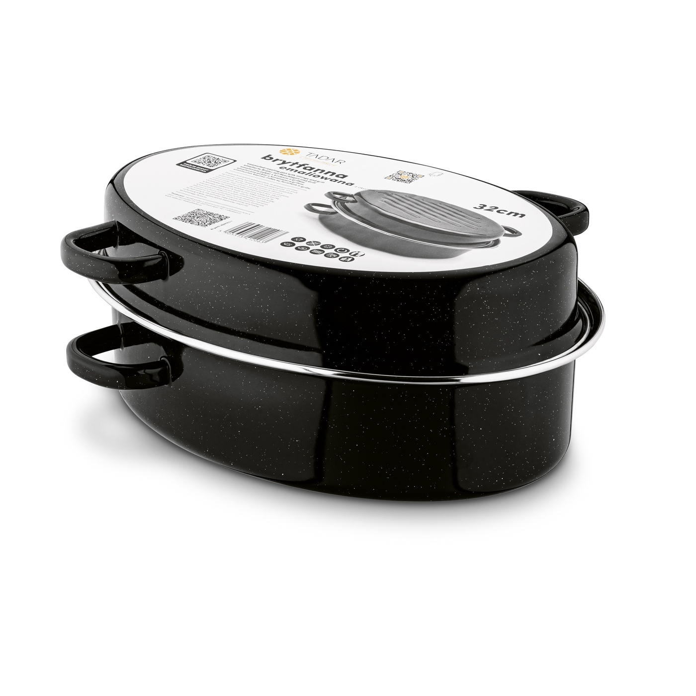 Овальна емальована сковорода Тадар з арматурою та грилем 32 см допоможе приготувати смачніше та соковитіше м'ясо. Верхню частину (глибше звичайної) можна використовувати для запіканок. Краї мають сталеві кріплення для ще більшої міцності. Виготовлений з емалі, це гарантує його довговічність. Його можна використовувати на індукційних, газових, електричних і керамічних плитах.