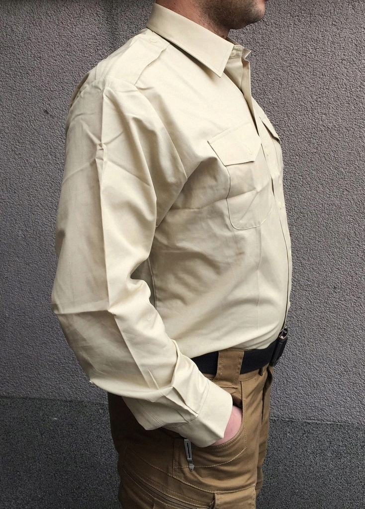 Оригінальна військова сорочка чоловічої статі з ресурсів британської армії. Популярний фаун Хакі -сорочка має довгий рукав. Він оснащений пагонами, застебнутими. У сорочці на грудях два кишені. Продукт ідеально підходить для повсякденного використання, для любителів військових, механіки тощо