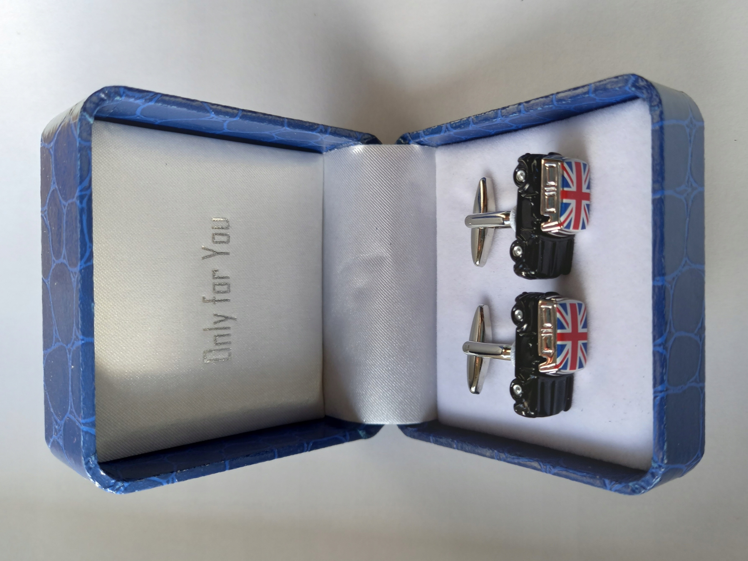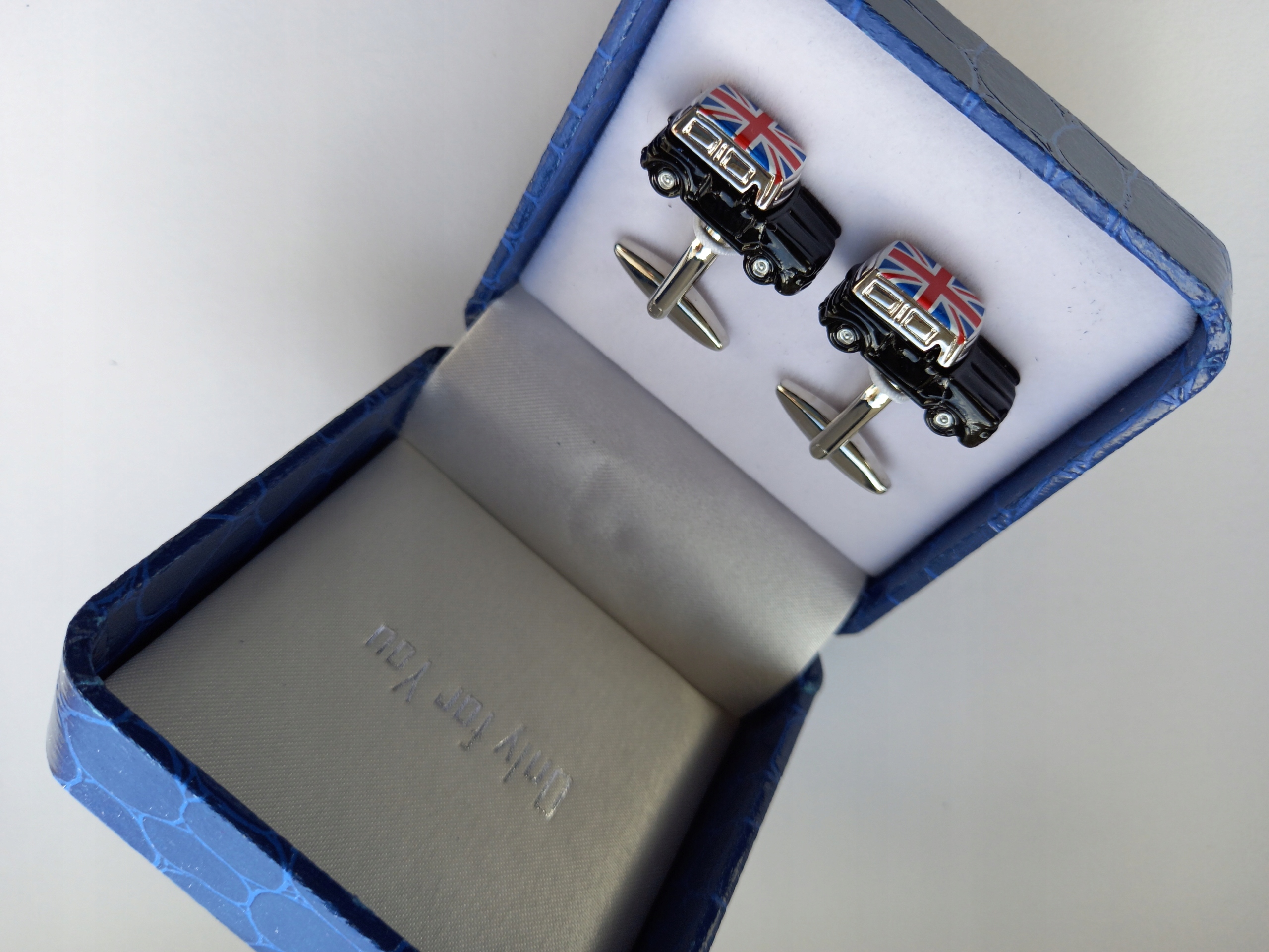 Модний набір сорочкових запонок у вигляді мініатюр символу Британії - Austin Mini Cooper з прапором на даху. Ідеальний варіант для шанувальника цього бренду. Запонки були виготовлені нашою фабрикою запонок як оригінальний дизайн з обмеженої серії «Тільки для вас» і упаковані в ексклюзивний футляр із візерунком зі зміїної шкіри.