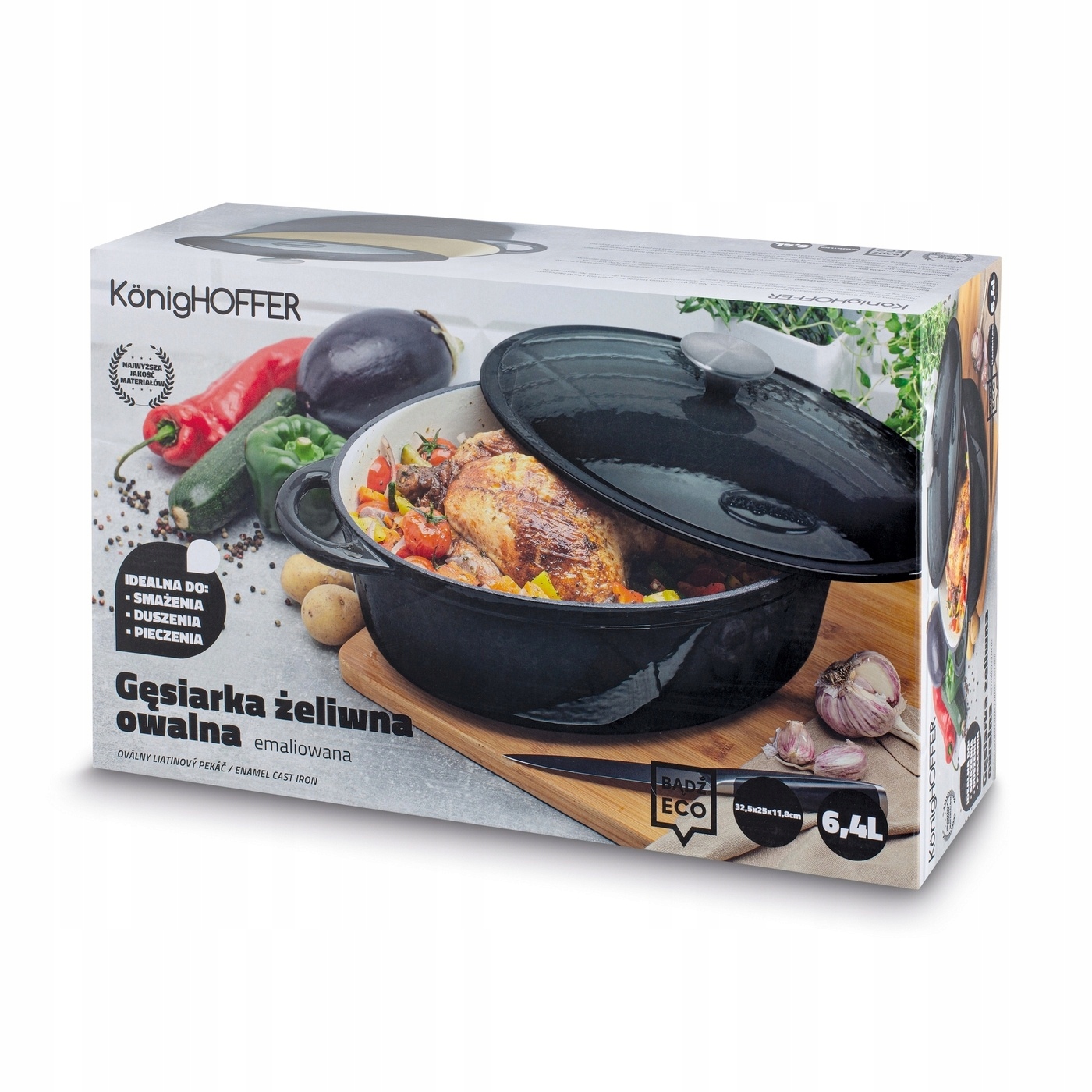 чавун -рон -рон Konighffer натуральний 6,5 л є овальним, важким і твердим. Ви можете готувати, тушкувати, смажити і запікати посуд в ньому. Використовуючи посуд в духовці, не перевищуйте 240 градусів. Завдяки чавунній кришці, прикріпленій до набору, ви можете відрегулювати кількість пари всередині гусака. Модель має класичний вигляд і може підкреслити знайомий персонаж та затишний декор вашої кухні. Ви навіть випікаєте традиційний хліб із закваски. Більше того, він підходить для будь -якого типу печі. Розміри чорного гусака - 51,5 х 26,5 х 18 см. Це один з найкращих варіантів цієї категорії!