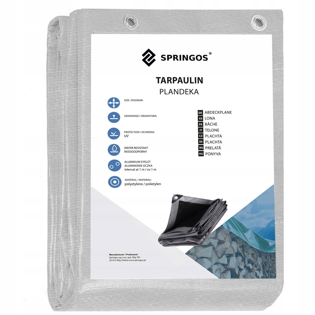 Брезент виготовлений з поліетилену, який є екологічно чистим, а це означає, що його можна використовувати як у будівництві, так і в сільському господарстві. Краї брезенту додатково посилені, а його кути оснащені товстими пластиковими вставками, які додатково стабілізують кути, завдяки чому він міцний і стійкий до розривів. Висока щільність 270 г/м2 матеріалу дозволяє вільно формувати брезент, не впливаючи на його довговічність і захисні властивості.