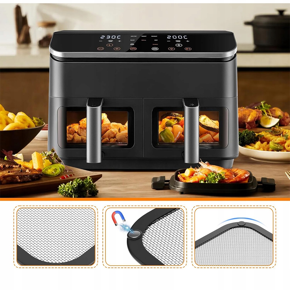 Захисна сітка кріпиться магнітом до верхньої частини фритюрниці для зручного використання. Примітка: зачекайте, поки пристрій охолоне, перш ніж знімати його. Можна мити в посудомийній машині після видалення магнітів (примітка: маленькі магніти крихкі, будьте обережні, щоб не зіткнутися)