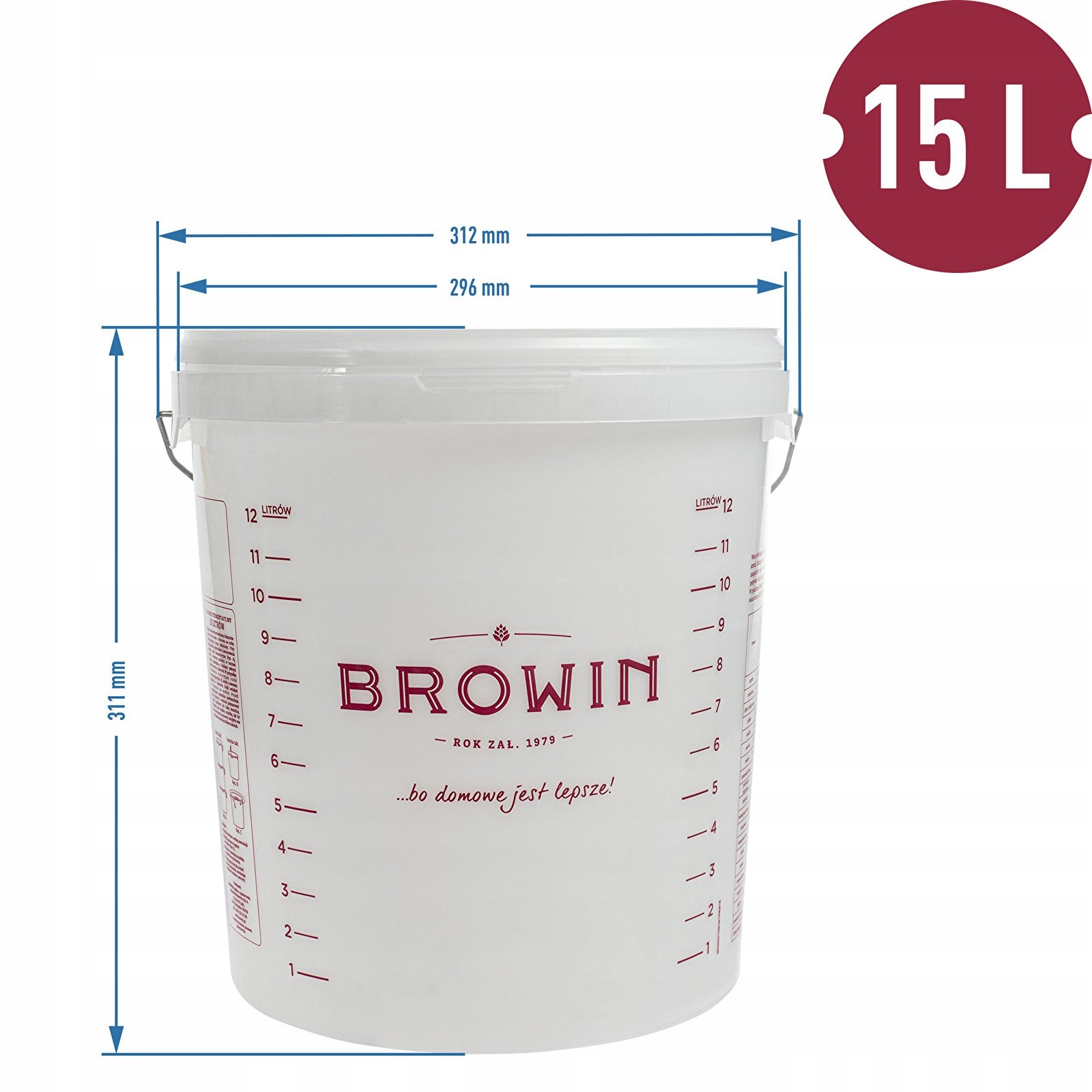 Економна ємність для бродіння об'ємом 15 л, в якій можна готувати улюблені домашні напої. Він виготовлений з білого матеріалу, призначеного для контакту з харчовими продуктами та характеризується високою міцністю та гнучкістю. Контейнери сертифіковані Національним інститутом гігієни (PZH), що дозволяє їм контактувати з харчовими продуктами та стійкі до зміни кольору в результаті контакту з дубильними речовинами з фруктів. Кришка з отвором і 2 ущільнювальні пробки, що входять в комплект, дозволяють закупорити ємність або поставити трубку для ферментації. Свердління додаткового отвору самостійно дозволяє встановити кутову трубу і проводити бродіння одночасно в декількох ємностях, поставлених одна на одну. Зручна ручка контейнера дозволяє його зручно переносити і транспортувати з місця на місце. Принт зі шкалою та порадами щодо приготування домашнього вина, пива та холодного м'яса дозволяє контролювати кількість в тарі та полегшує приготування домашніх страв.
