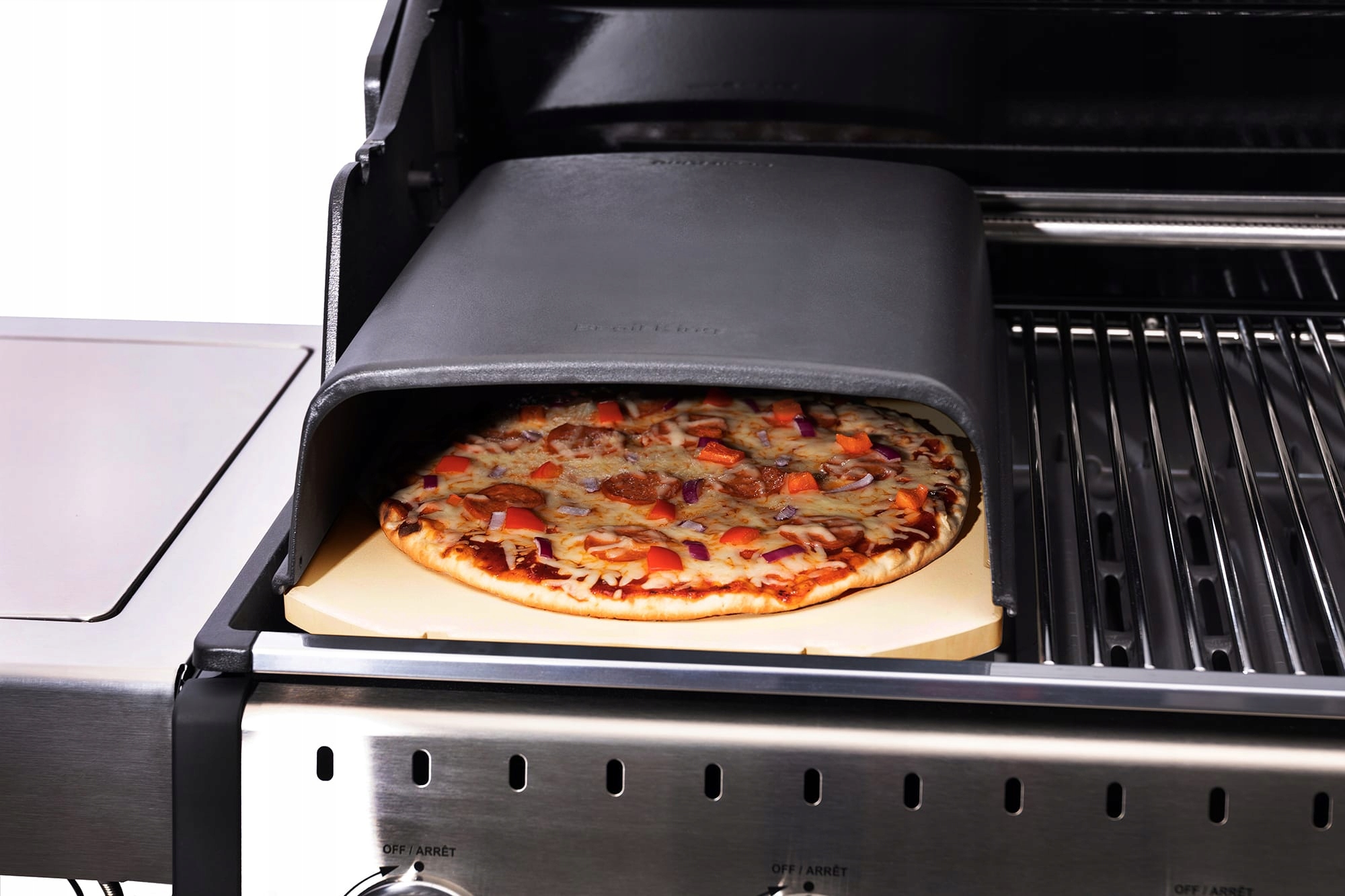 Піца з чавуну гриль, яка гарантує, що піца буде ідеально запечена навіть зверху. Піч відкрита ззаду, що дозволяє використовувати кутовий пальник, і це в результаті спрямовує гаряче повітря безпосередньо до духовки. Результат - ідеально запечена, хрустка піца. Ціна призначена лише для піци, без каменю та тарілки, яку можна придбати.