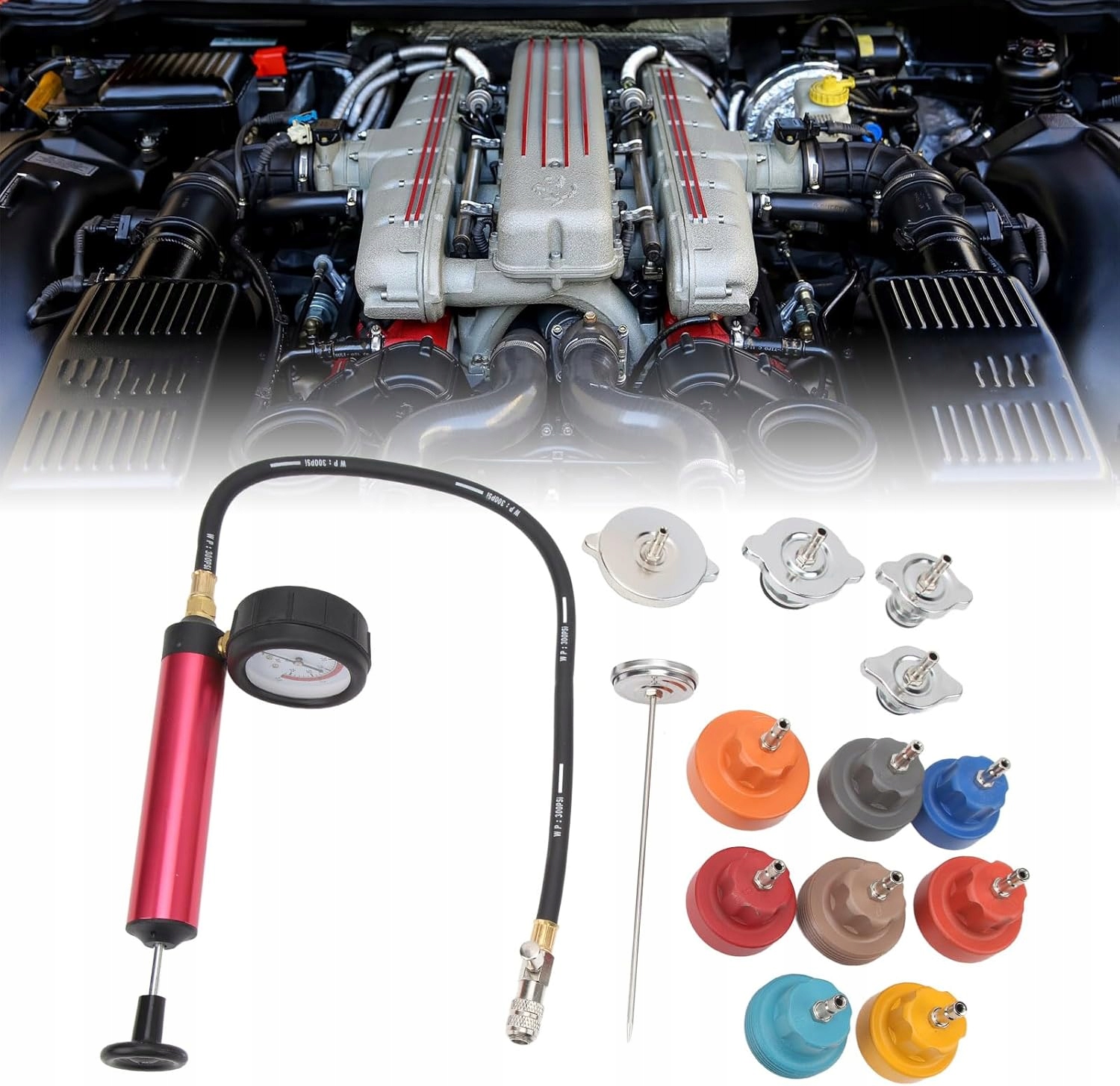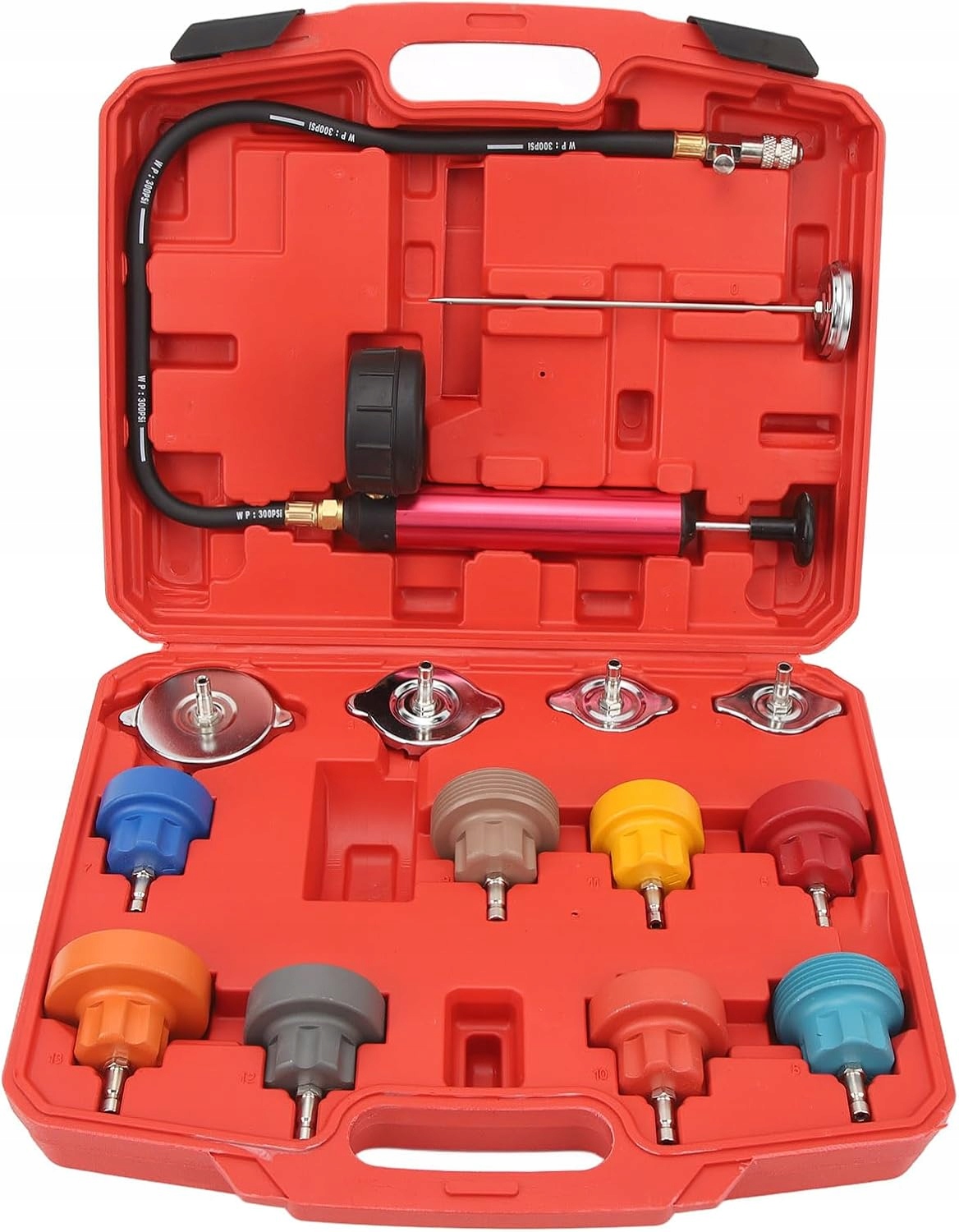 Цей набір спеціально розроблено для перевірки тиску в системах охолодження та радіатора автомобіля, гарантуючи безперебійну та ефективну роботу системи.