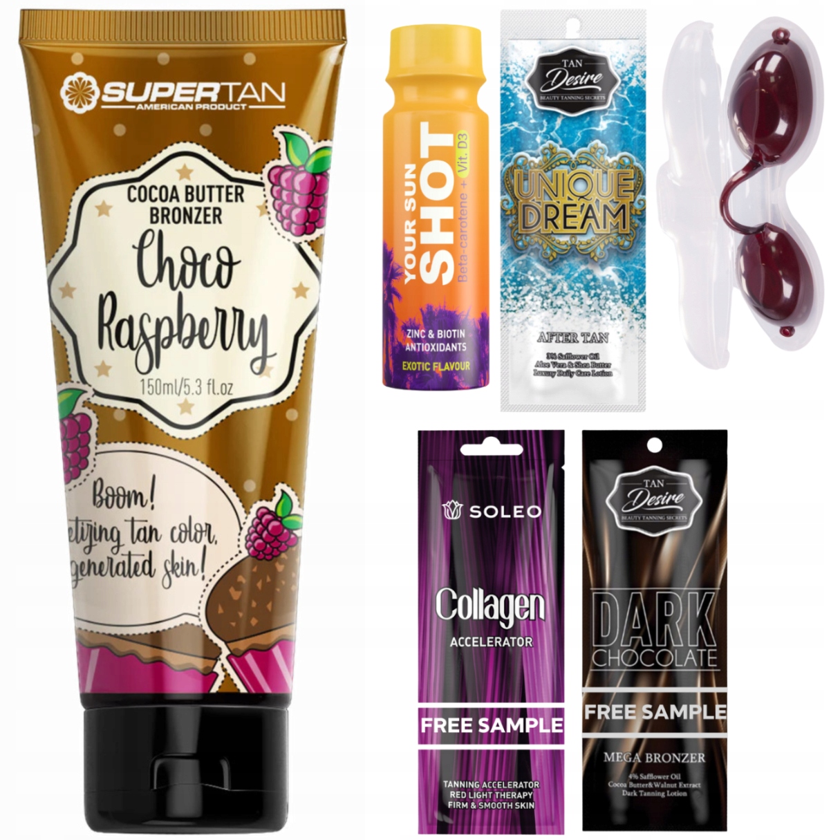 ❗Бронзатор Supertan Choco Raspberry + Free Shot, пакетик після засмаги 15 мл, окуляри, 2 випадкові зразки по 5 мл кожен❗