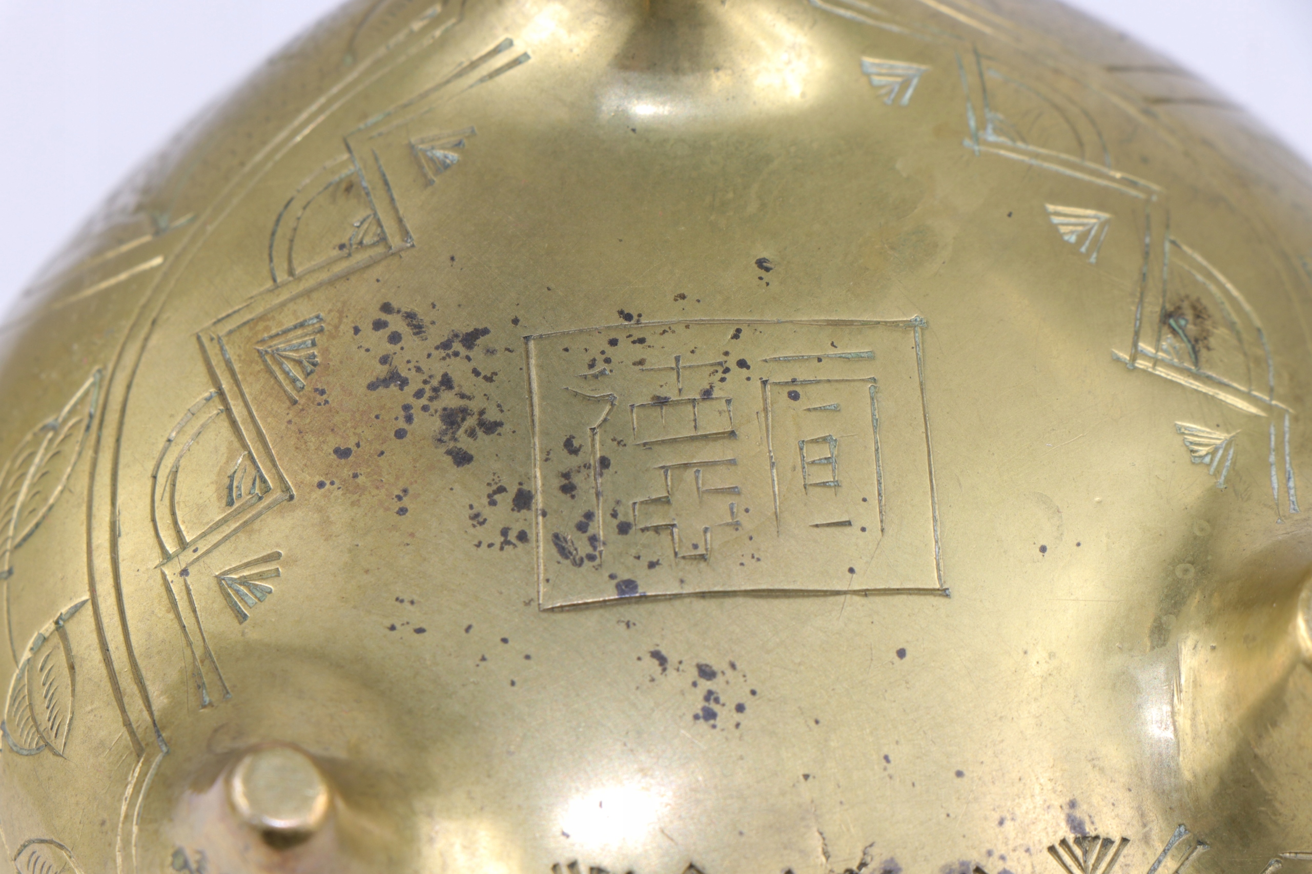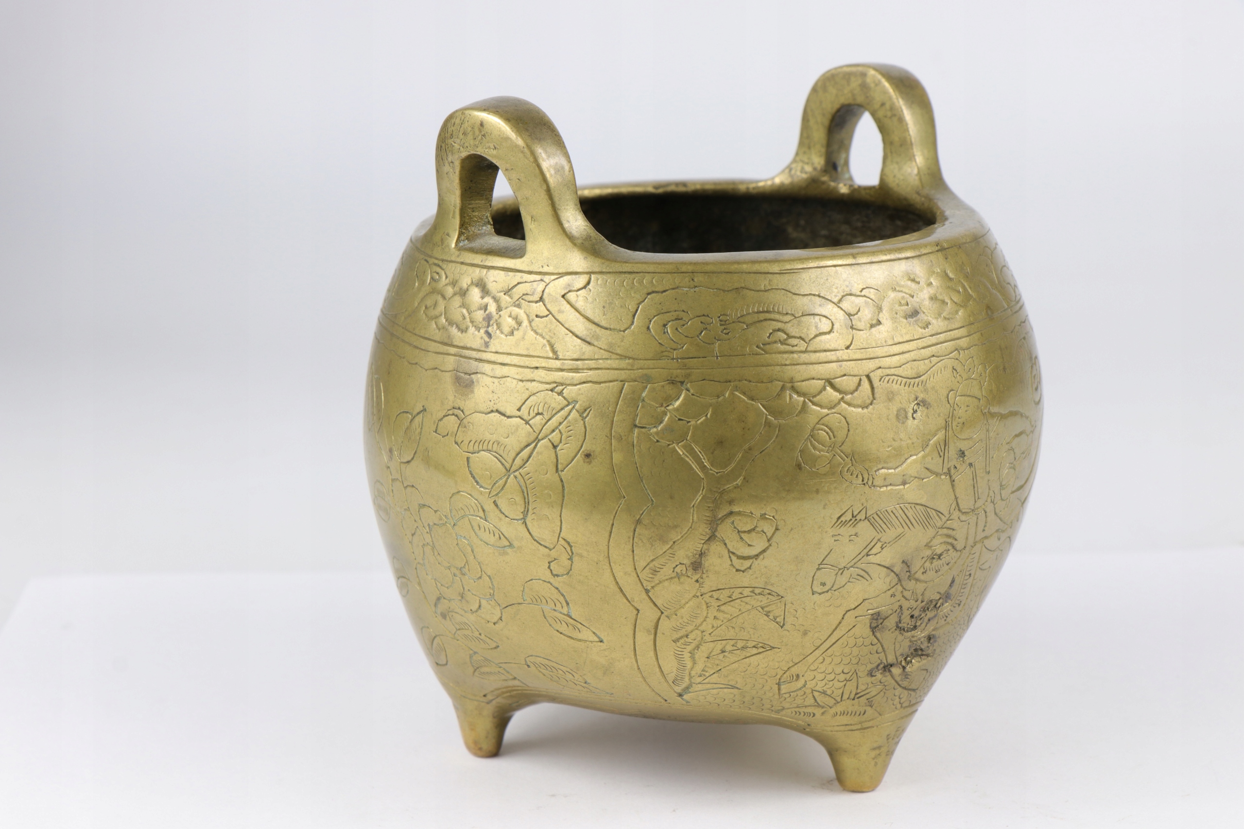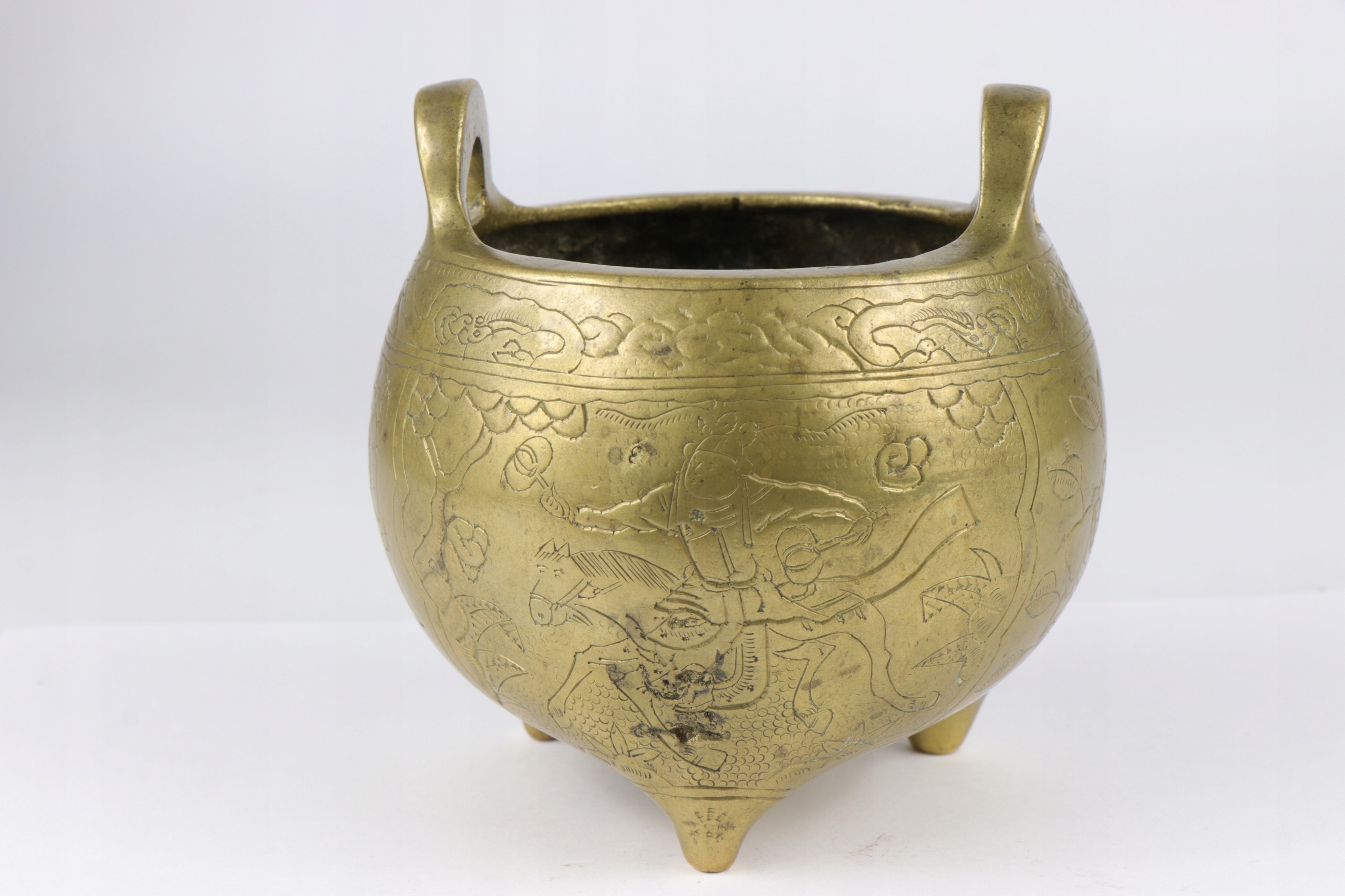 Бронзова кадильниця, прикрашена орнаментом китайських воїнів. Підпис внизу.