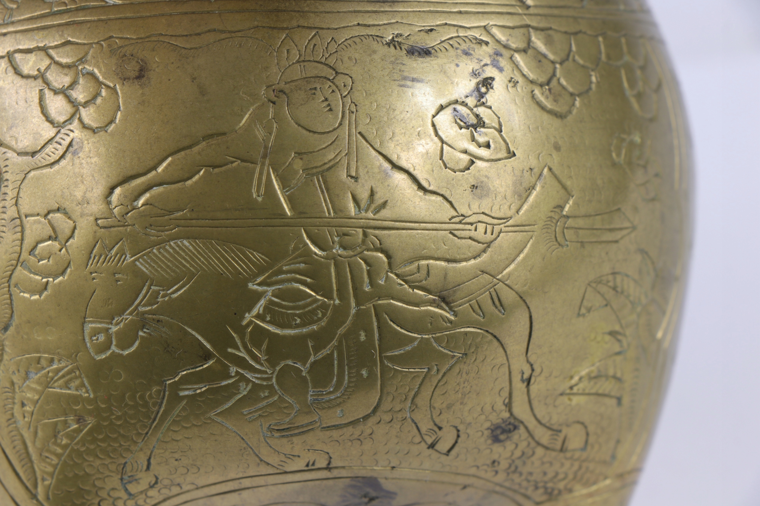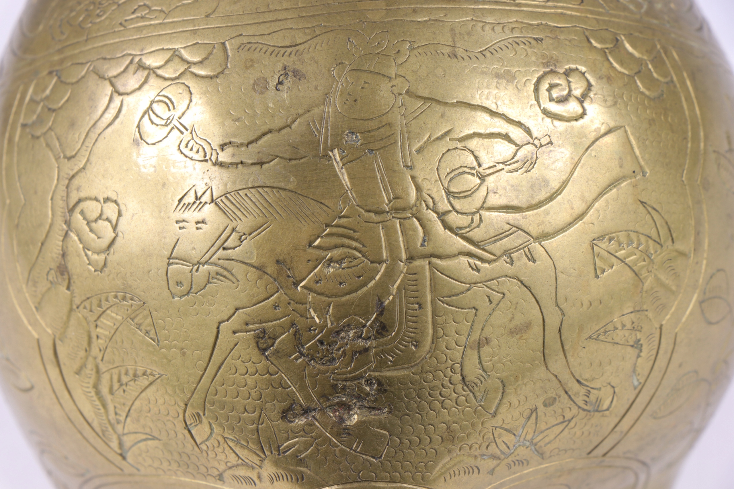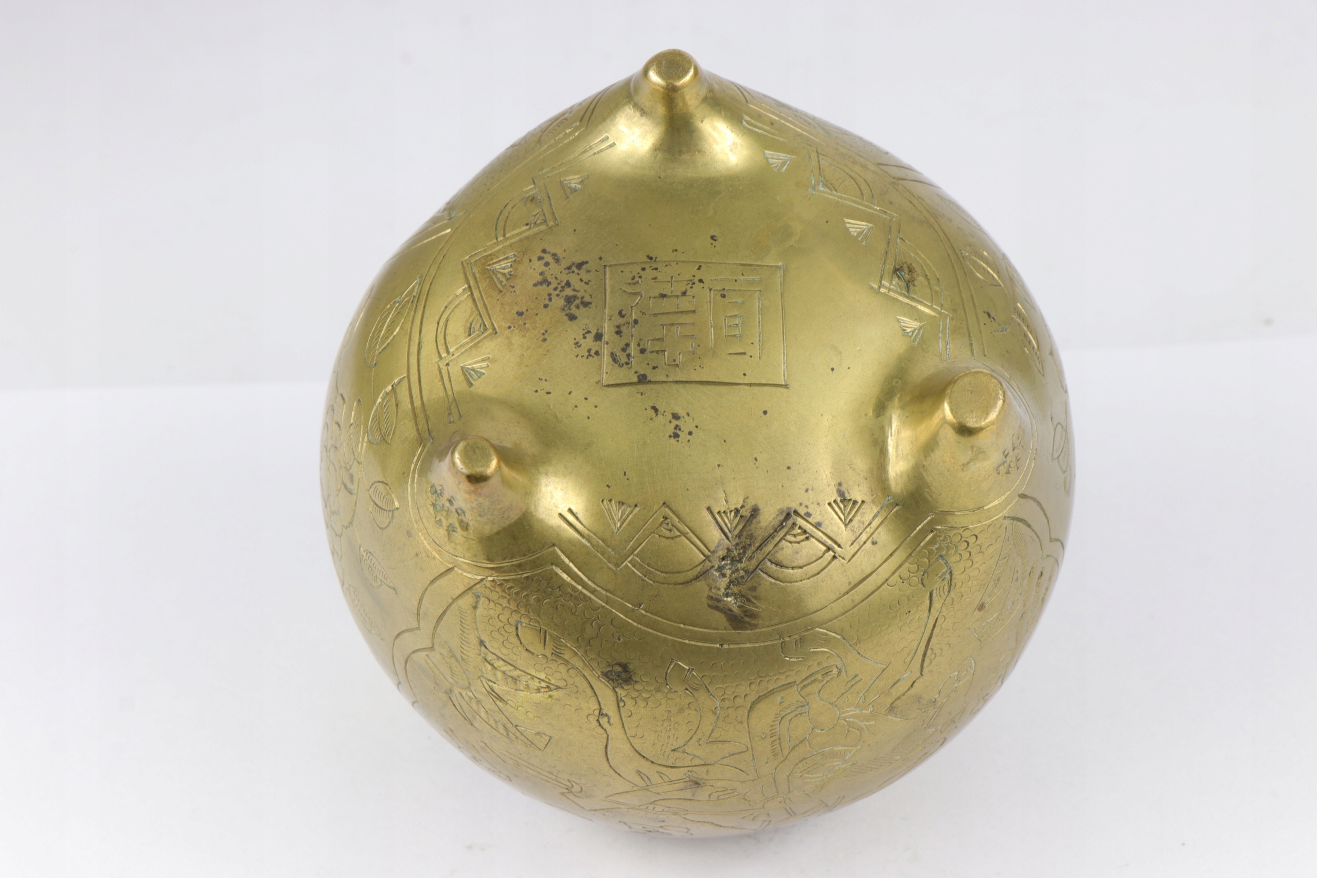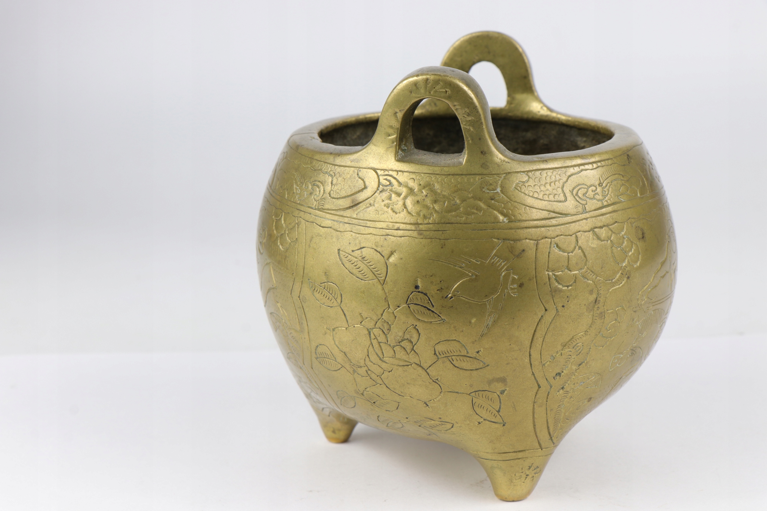 Бронзова кадильниця, прикрашена орнаментом китайських воїнів. Підпис внизу.