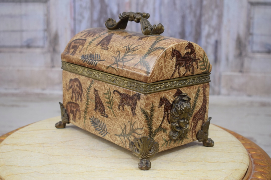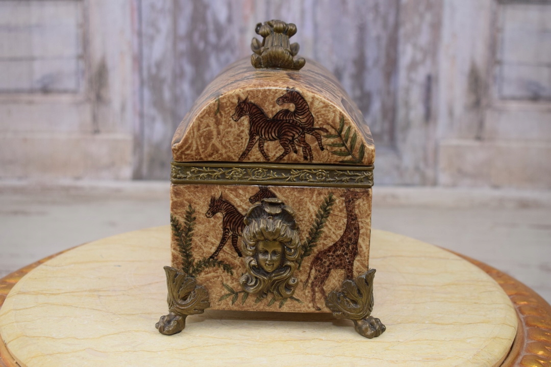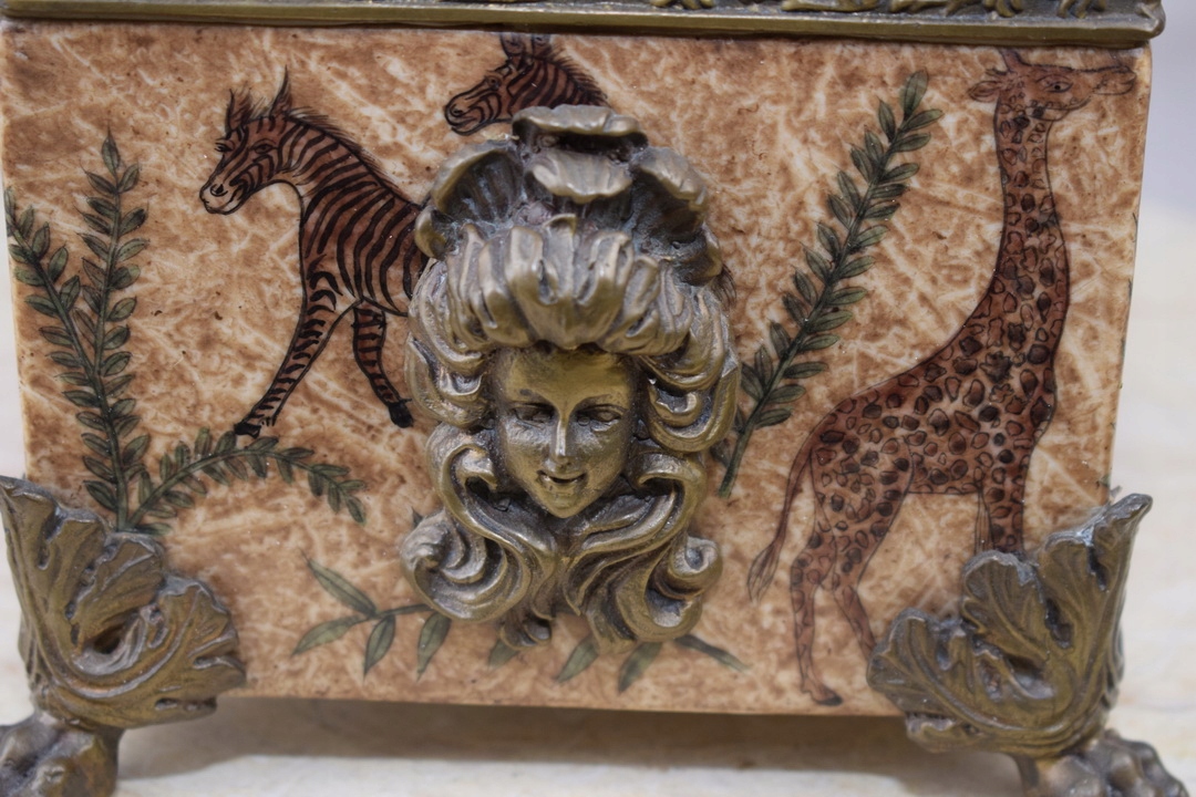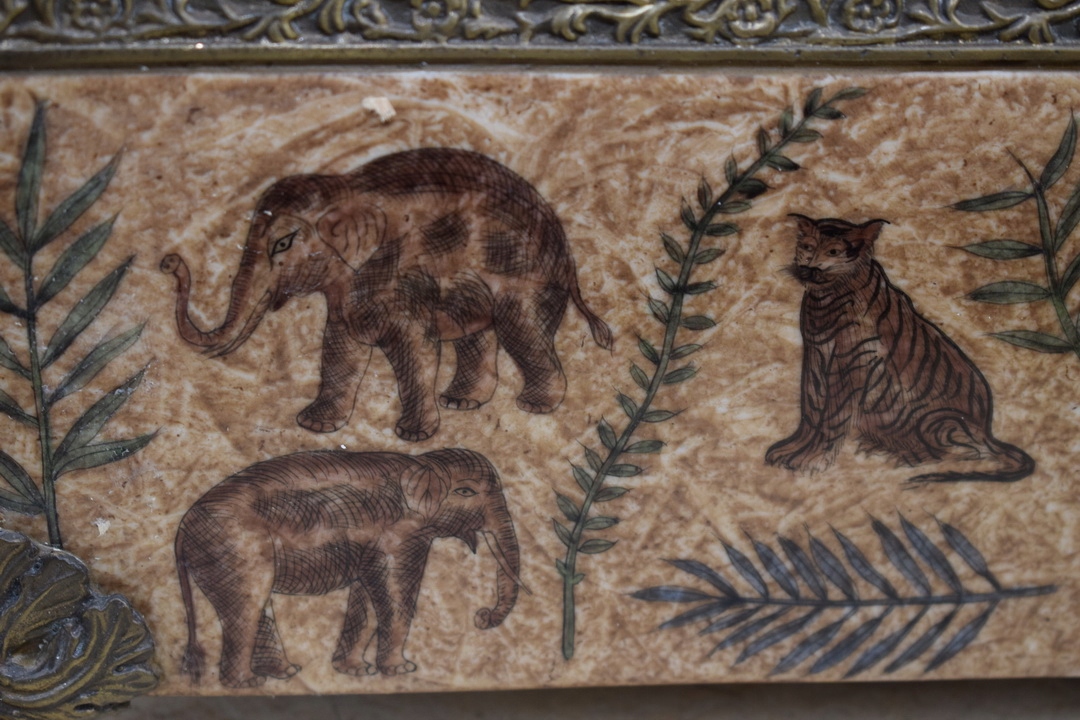 Бронзова порцелянова шкатулка - Тварини Слон Тигр - Бронзова фурнітура