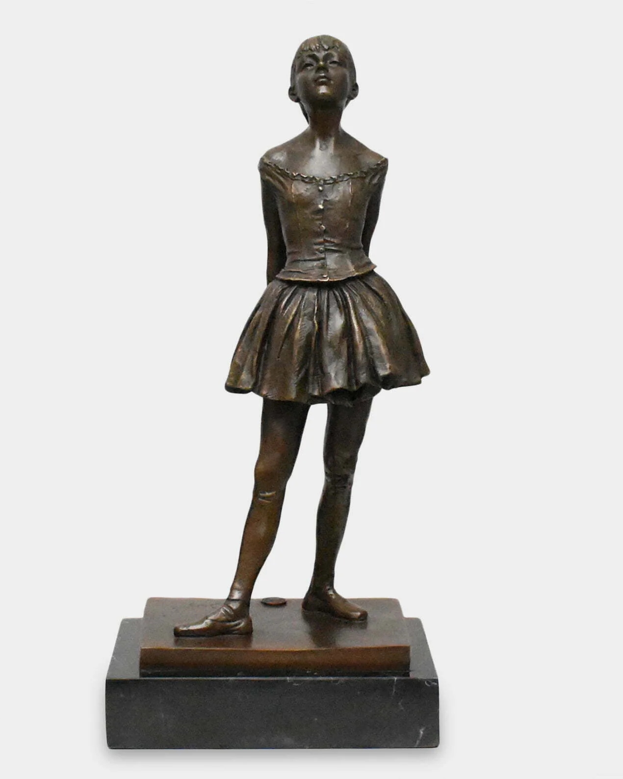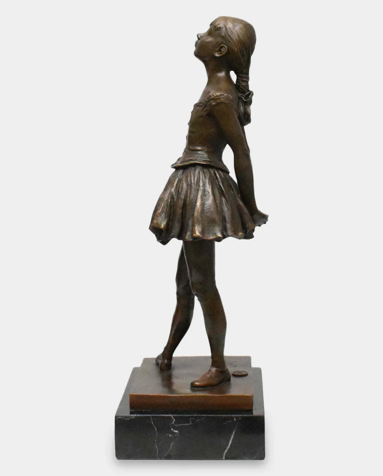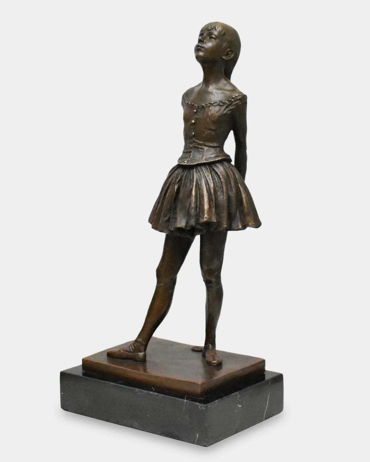 Реалістична бронзова скульптура 14-річної балерини, натхненна роботою Едгара Дега «Маленька 14-річна танцівниця». Красива, підписана скульптура, виконана з ексклюзивного матеріалу, дуже точно, з увагою до найменших деталей. Встановлюється на основу з чорного мармуру. Фігурка справляє чудове естетичне враження та має позачасовий стиль. Підходить до багатьох інтер'єрів.