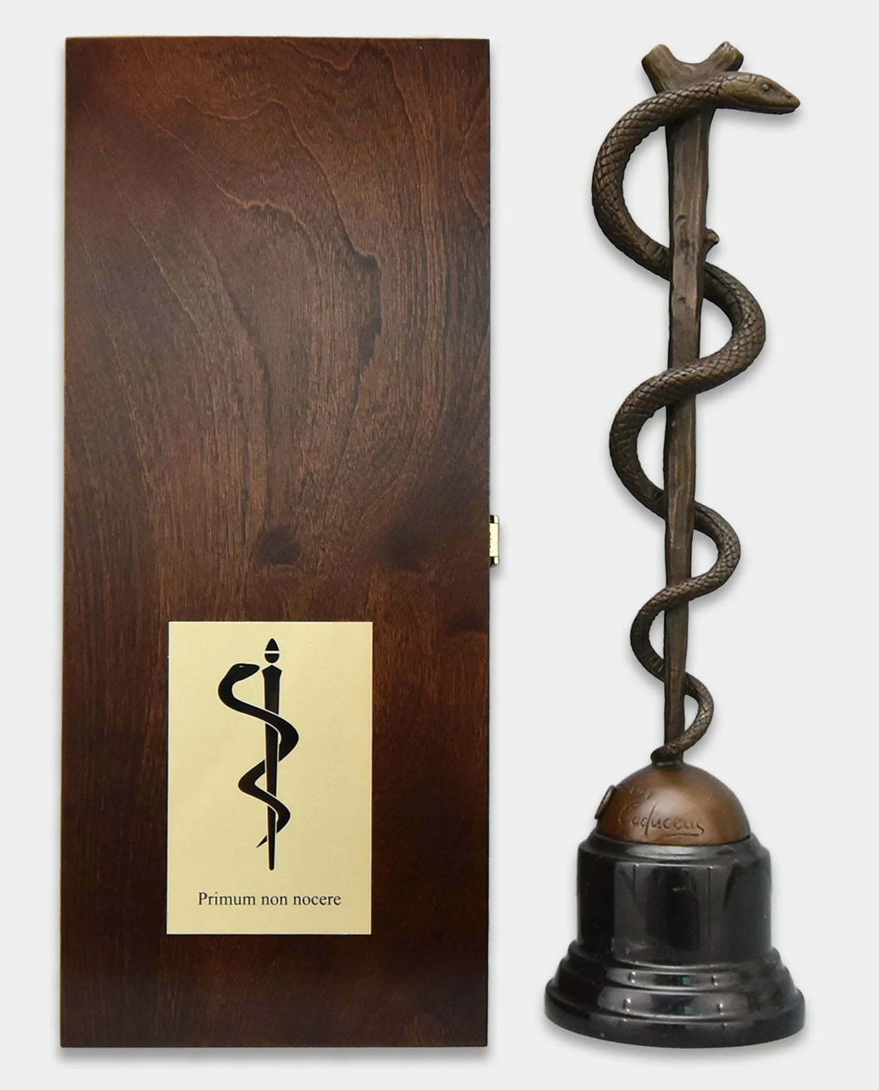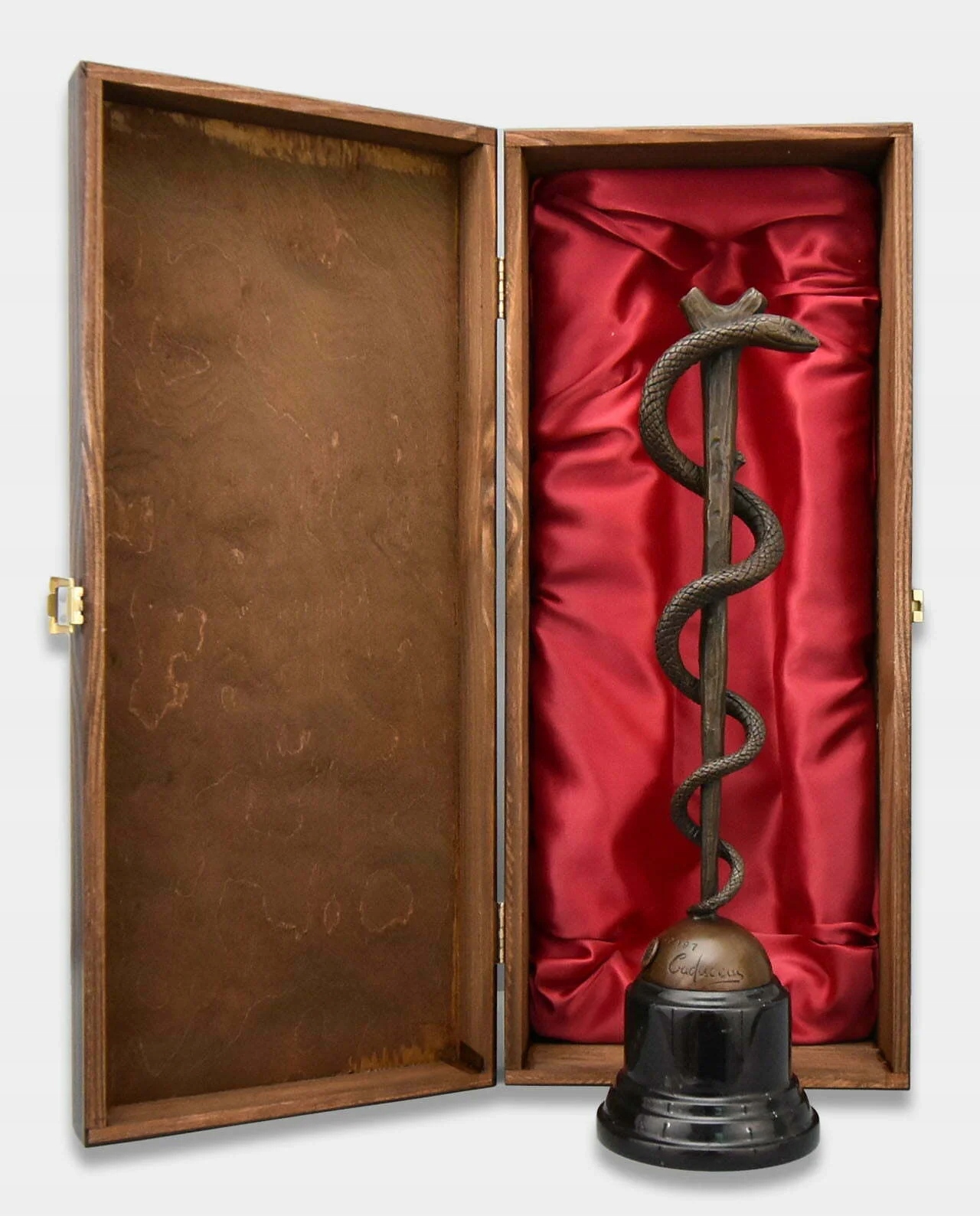 Ідеальний подарунок для лікаря, медсестри або фармацевта - скульптура з зображенням змії Ескулапа, що звивається навколо дерев'яного посоха. Це зображення було символом медицини з давніх часів. Бронзова статуетка, упакована в елегантну дерев'яну подарункову коробку, обшиту червоним атласом. Красива, підписана фігура, виготовлена з ексклюзивного матеріалу - бронзи, дуже точно, з увагою до найдрібніших деталей. Встановлюється на основу з чорного мармуру. Фігурка справляє чудове естетичне враження та має позачасовий стиль. Подарунок доповнюється персоналізацією - на кришку коробки можна додати вигравірувану табличку з індивідуальною присвятою. Чудова ідея, щоб подякувати фахівцеві за успішну операцію або як сувенір для випускника-медика після закінчення навчання або спеціалізації.