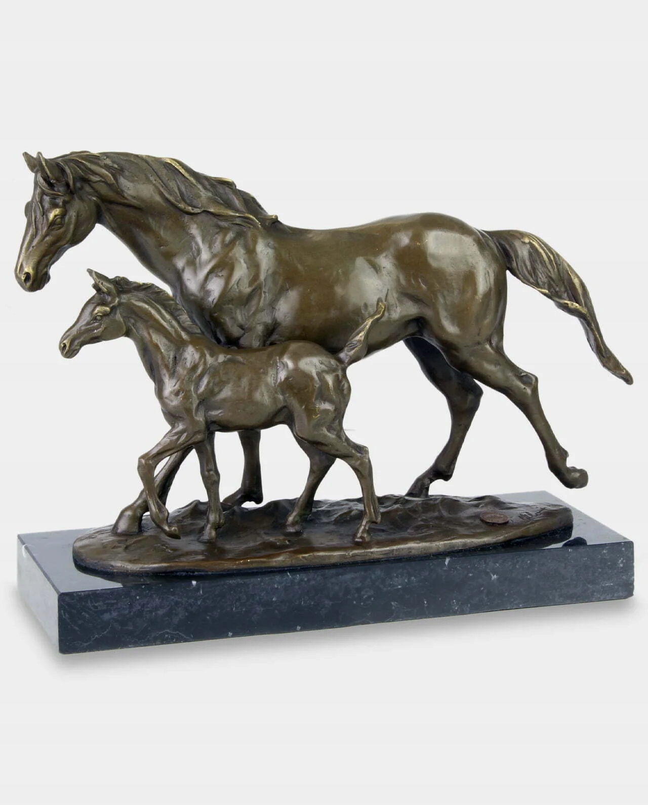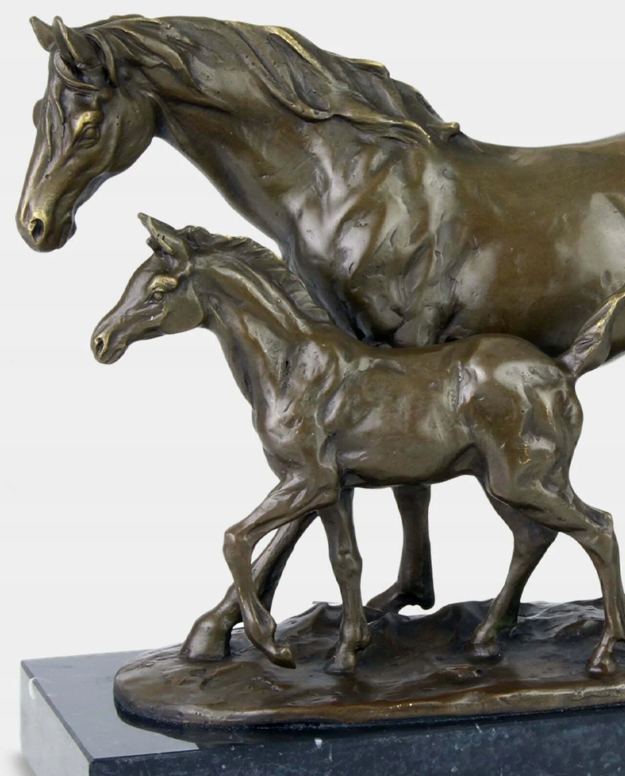 Бронзова скульптура, що зображує двох коней рисистих - кобилу і лоша. Красива, підписана скульптура, виконана з ексклюзивного матеріалу, дуже точно, з увагою до найменших деталей. Встановлюється на основу з чорного мармуру. Фігурка справляє чудове естетичне враження та має позачасовий стиль. Підходить до багатьох інтер'єрів.