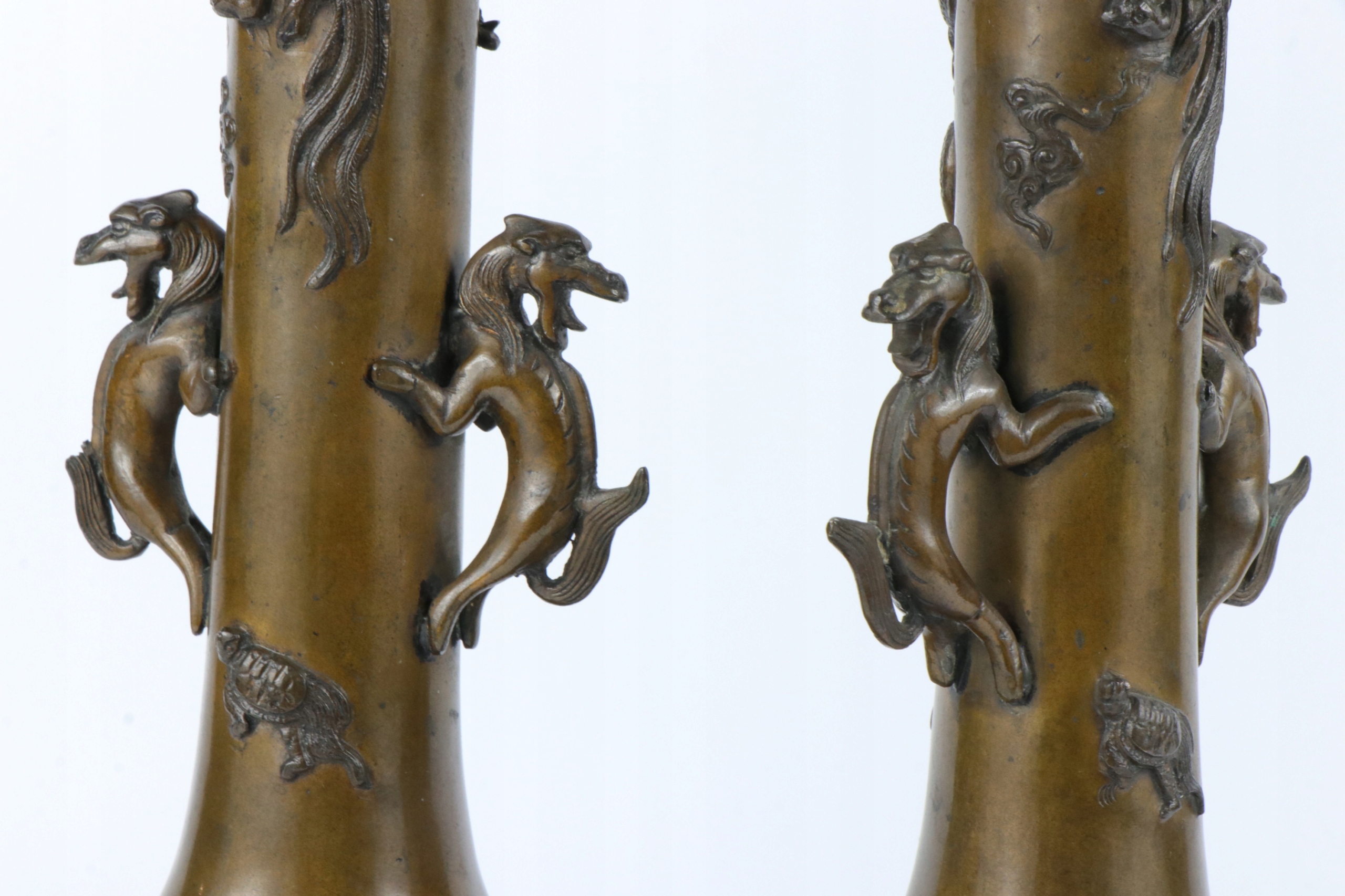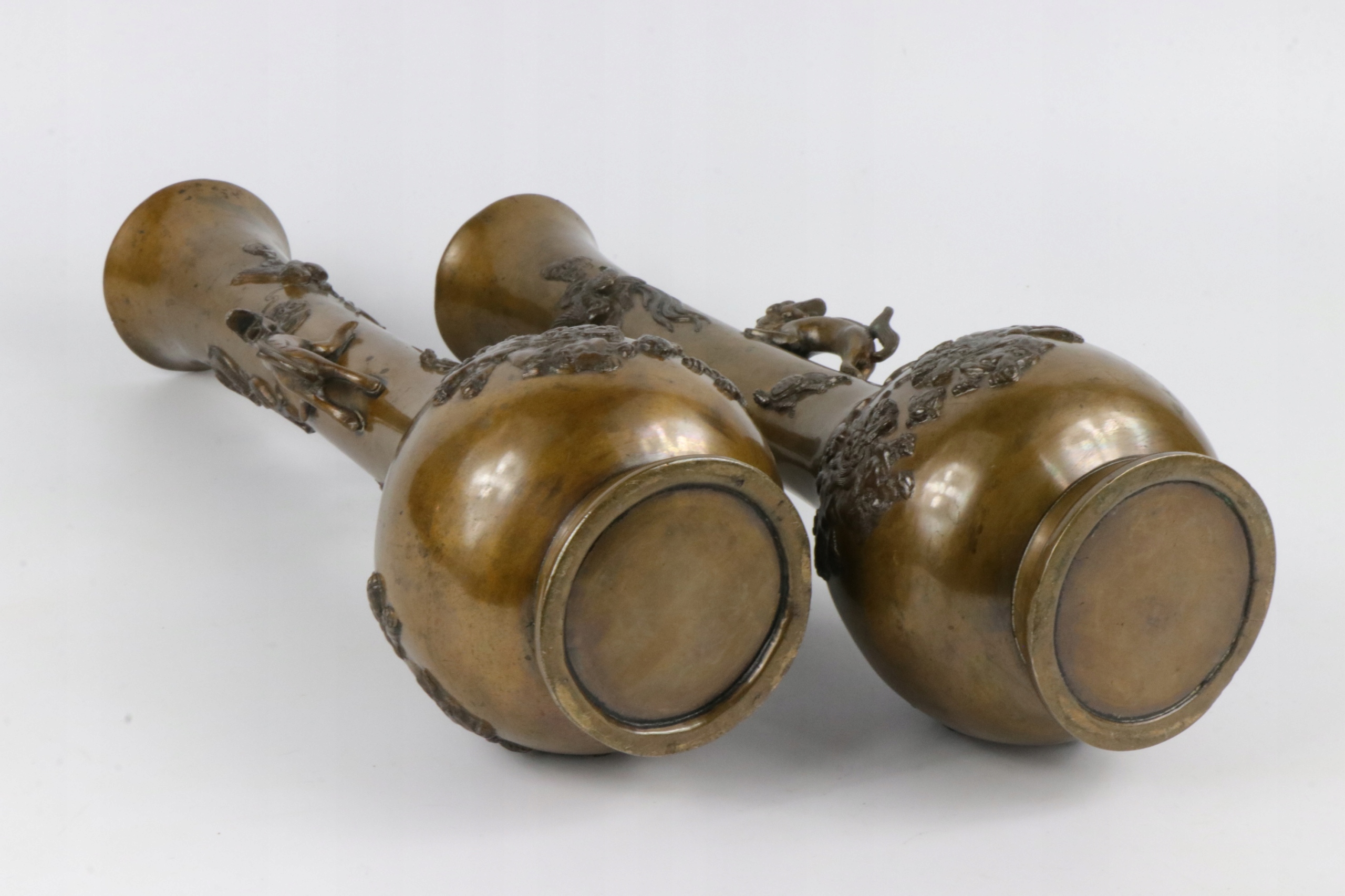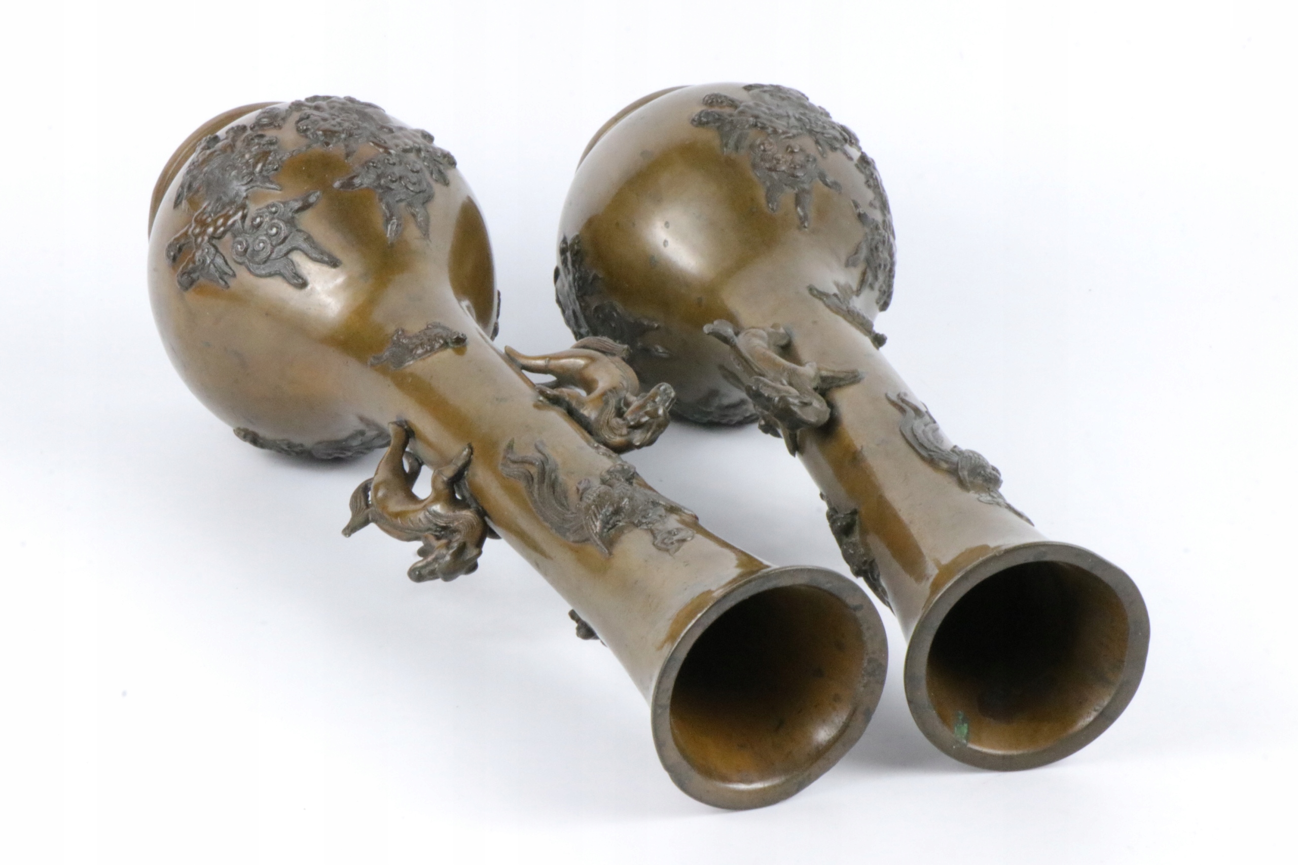 Дві японські камінні вази, бронзове лиття. Вази періоду Мейдзі, 19 століття. Вази прикрашені рельєфним орнаментом у традиційному східному візерунку, животи прикрашені парами собак Фу у верхній частині, драконом з одного боку, феніксом з іншого, маленькими черепахами посередині між основними орнаментами. . Ручки у формі якихось міфічних тварин. Товста бронза, масивні предмети, звичайно, з 19 століття.
