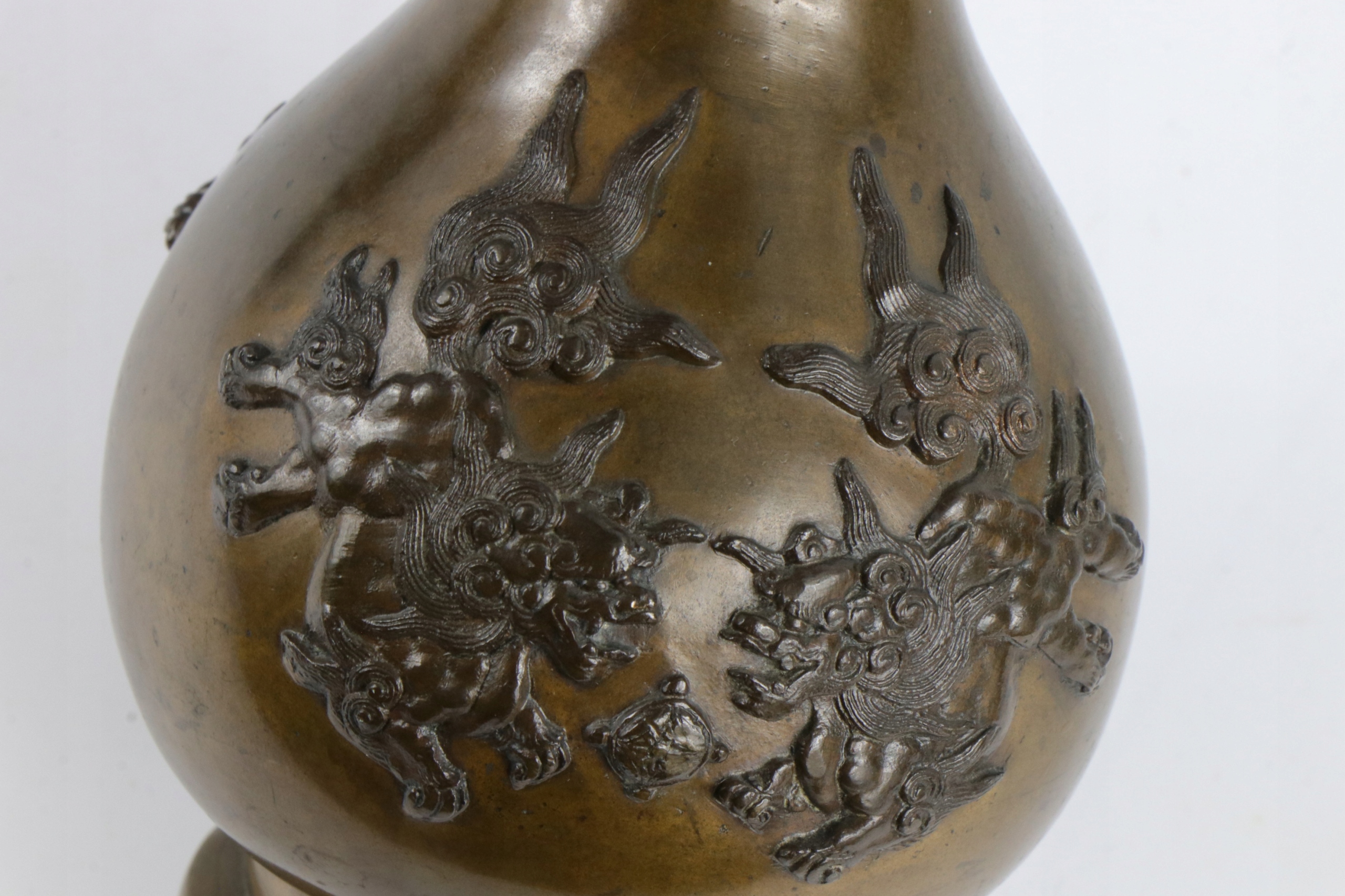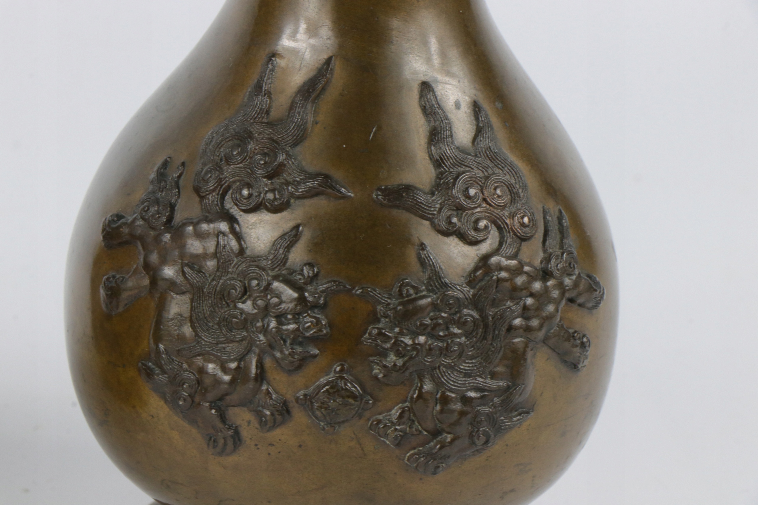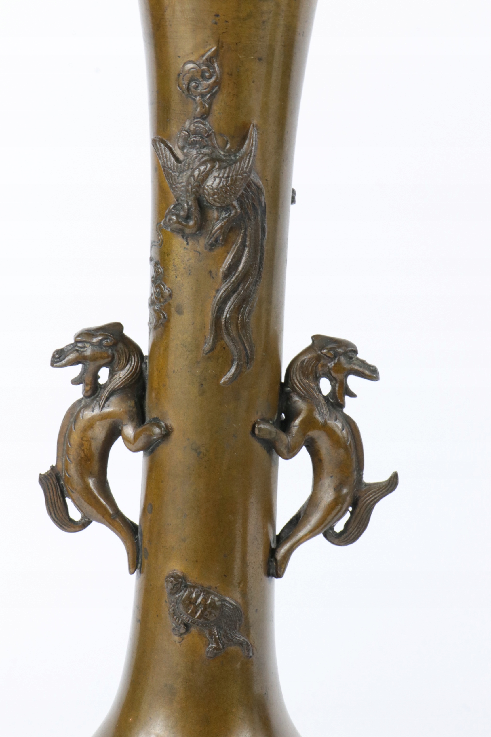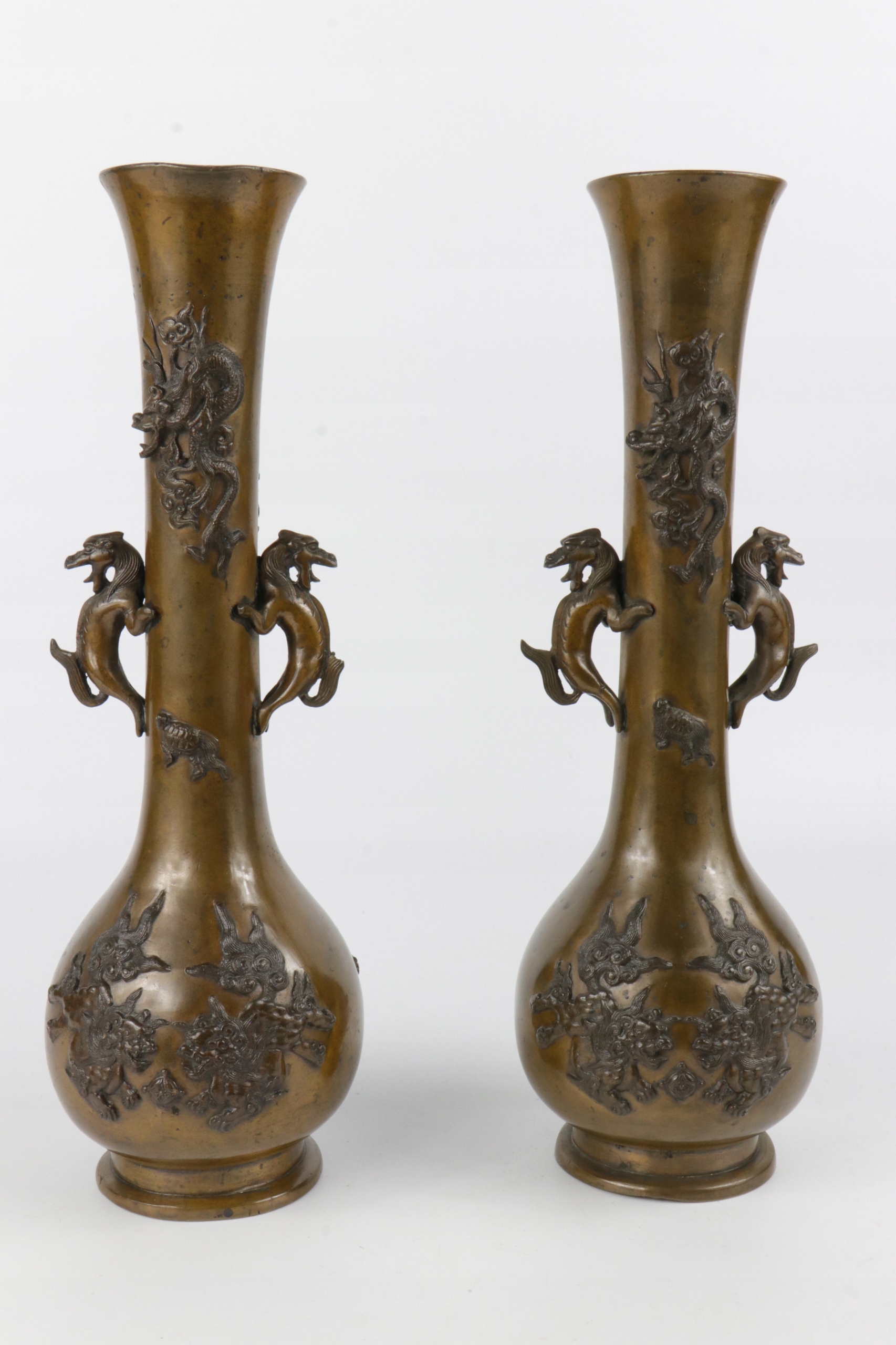 Дві японські камінні вази, бронзове лиття. Вази періоду Мейдзі, 19 століття. Вази прикрашені рельєфним орнаментом у традиційному східному візерунку, животи прикрашені парами собак Фу у верхній частині, драконом з одного боку, феніксом з іншого, маленькими черепахами посередині між основними орнаментами. . Ручки у формі якихось міфічних тварин. Товста бронза, масивні предмети, звичайно, з 19 століття.