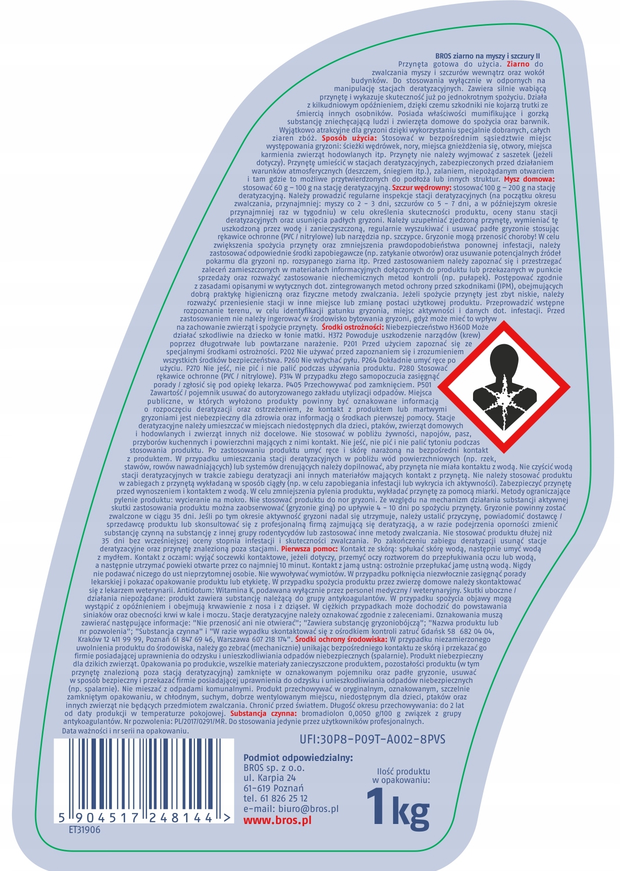 Він містить сильно привабливу приманку та ефективний лише після одного споживання. Діє з затримкою в кілька днів, завдяки чому шкідники не пов'язують отруту зі смертю інших особин. Він має муміфікуючі властивості та містить барвник і речовину, яка відлякує людей і домашніх тварин від його споживання. Надзвичайно привабливий для гризунів завдяки вмісту спеціально відібраних цільних зерен.
