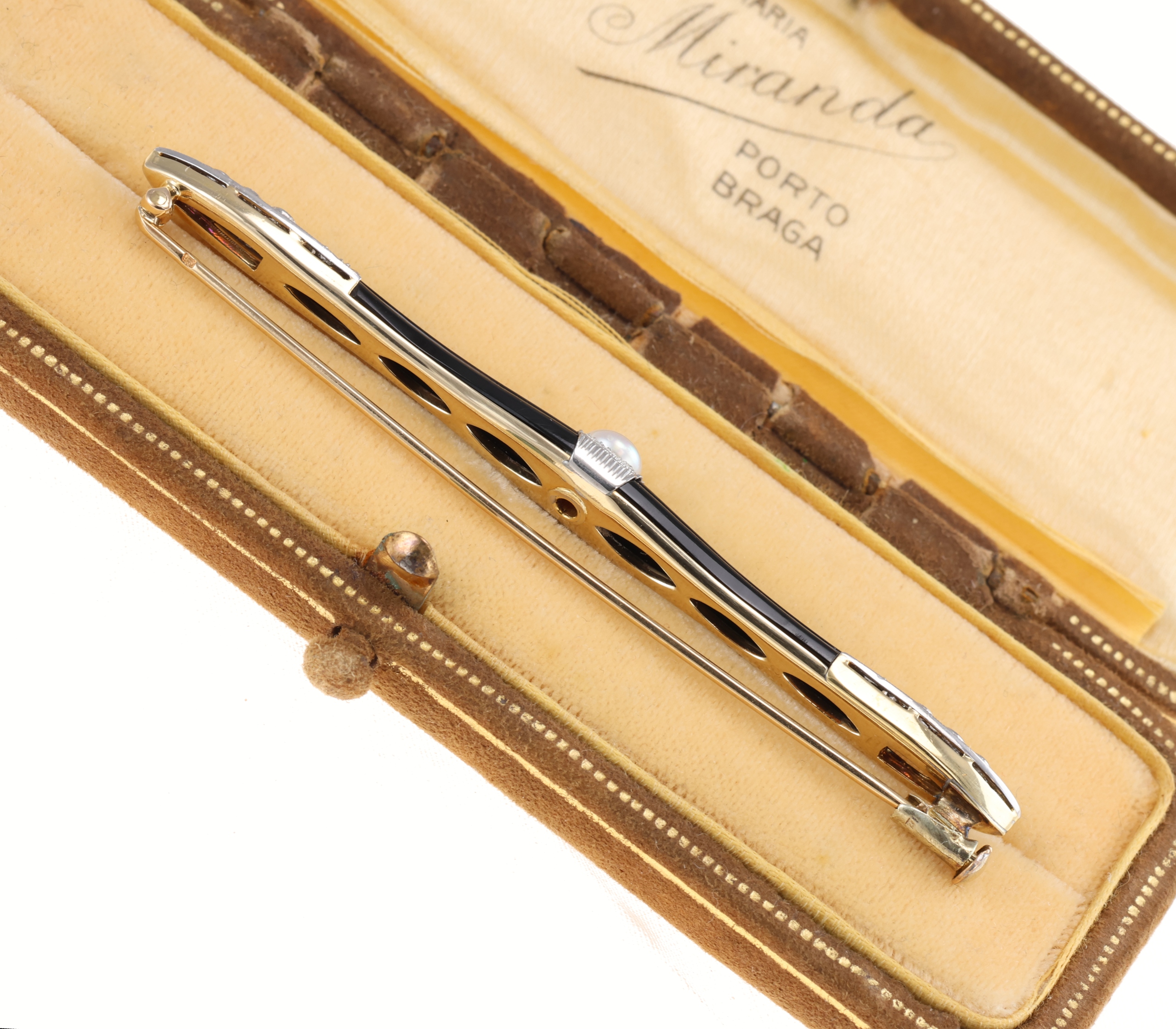 Предмет продажу: елегантна довгаста брошка в стилі артдеко. Його поверхня прикрашена різьбленими каменями чорного оніксу в поєднанні з блиском морських перлин. Ніжне платинове мереживо, хитромудро всипане діамантами загальною вагою 0,22, додає композиції легкості та вишуканості. Все це віє розкішшю та вишуканістю, типовими для старих коштовностей. Булавка виготовлена із 14-каратного золота.