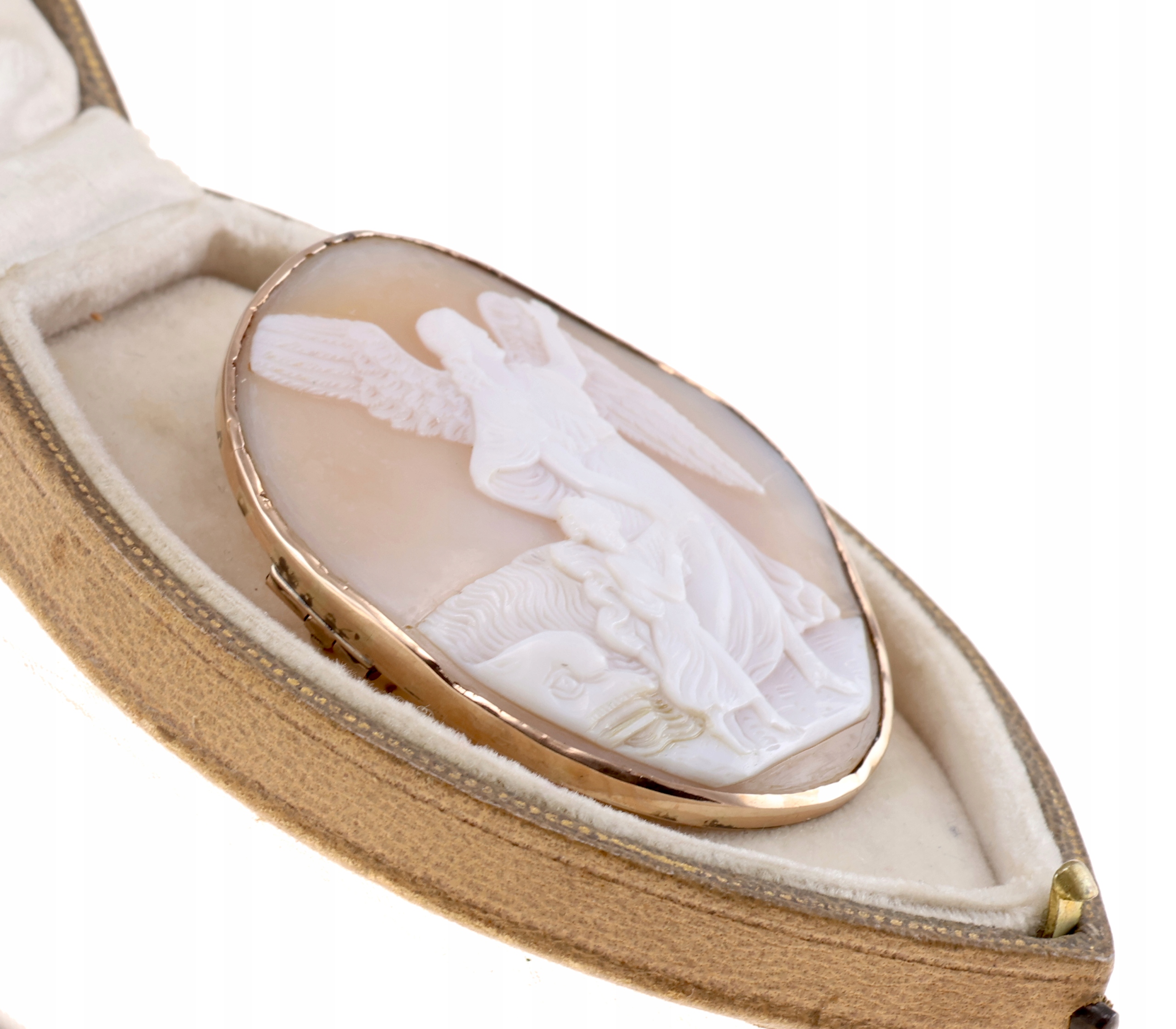 Предметом продажу є камея, вирізана в натуральній мушлі, зображення ангела-охоронця, який піклується про дитину - мотив, який часто зустрічається в ювелірних виробах вікторіанського та пізнішого періодів. Рельєф глибокий і м’яко моделюється, що підкреслює крила та шати фігур. Оправа виготовлена з жовтого золота 500 проби класичної простої форми.