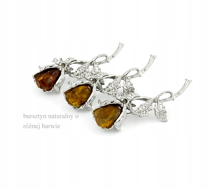 БРОШКА СРІБНА ТРОЯНДА З БУРШТИНОМ
