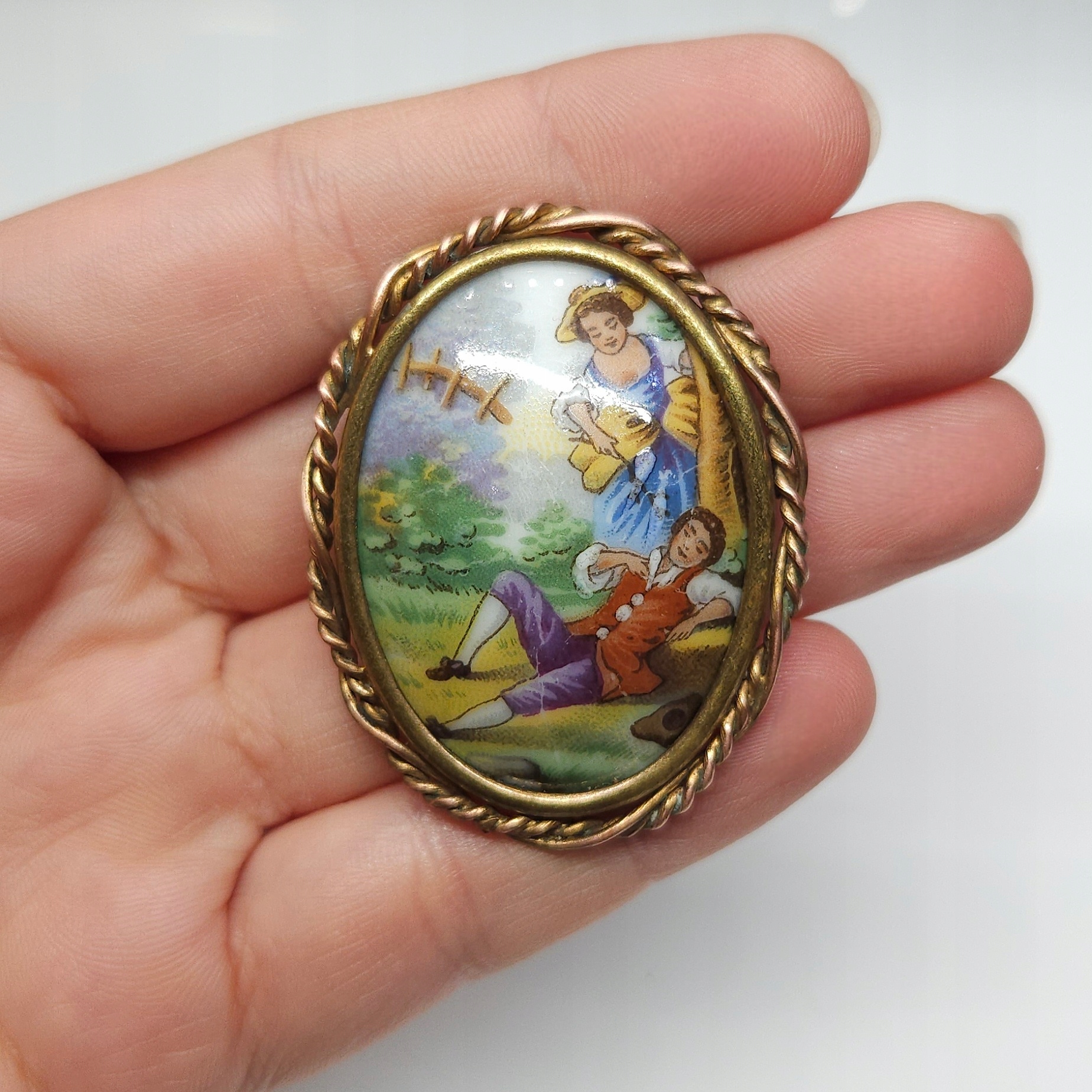Предмет продажу - овальна брошка з ліможської кераміки, прикрашена жанровою сценою, виконана в техніці деколь