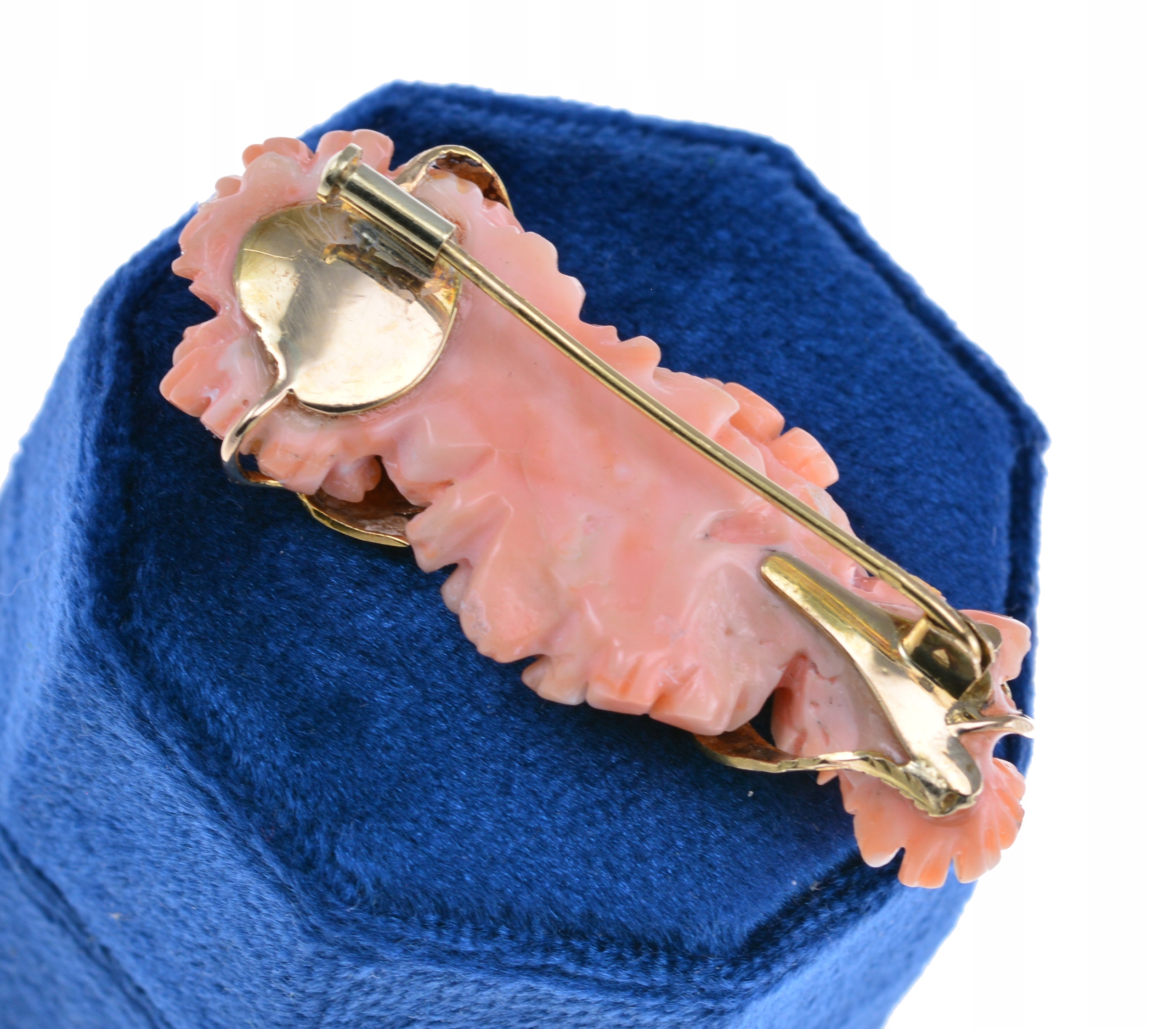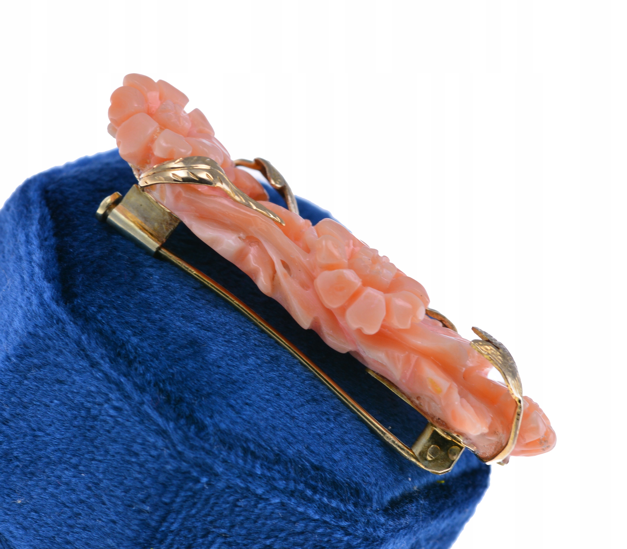 Предмет продажу - розкішна золота брошка з натуральним кораловий ніжно-рожевий колір - шкіра ангела. Корал, вирізаний у вигляді квітів, обвивається аплікаціями з золота вищої проби. Брошку можна носити як кулон.