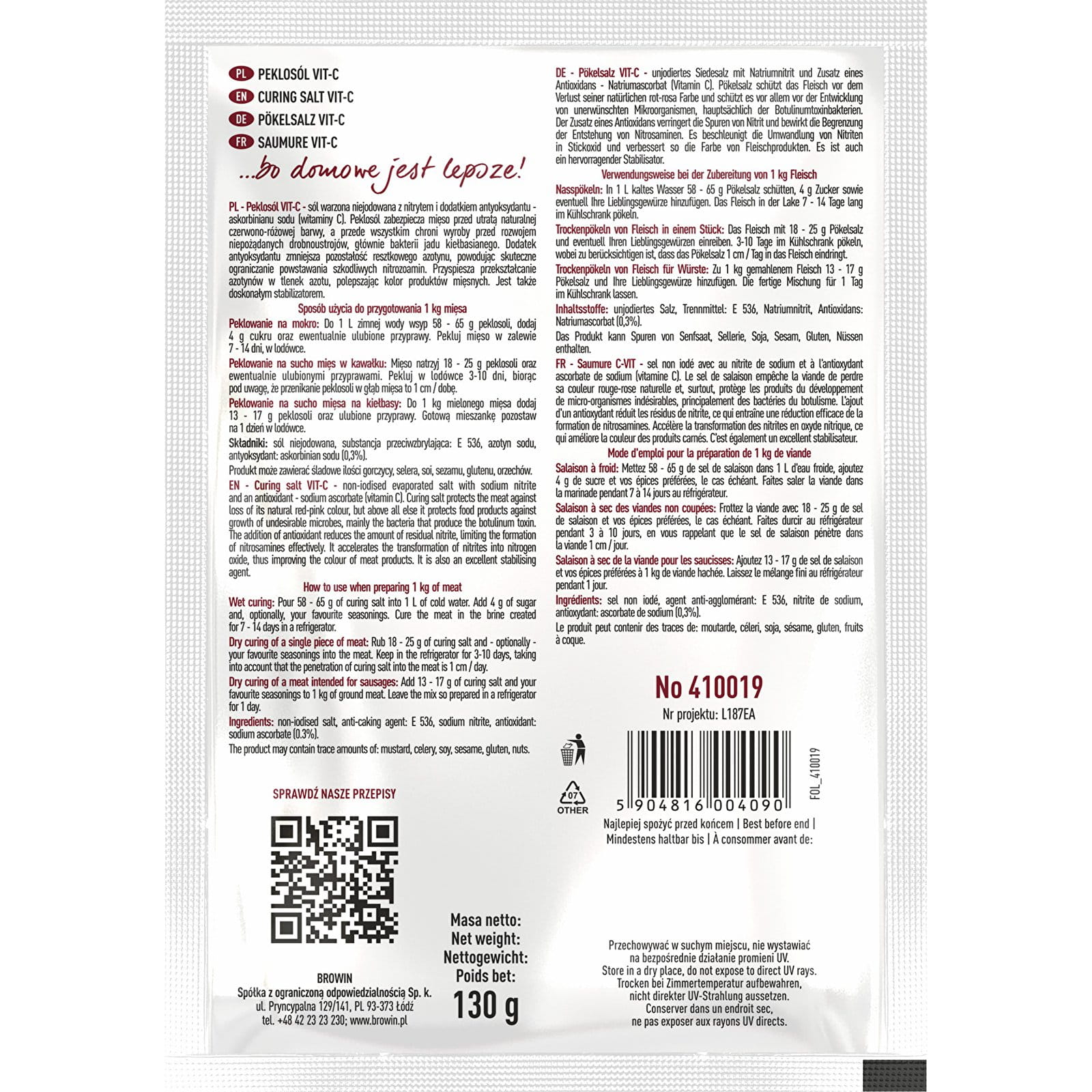 Що таке сіль для маринування, також відома як сіль для маринування або сіль для травлення? Це не що інше, як суміш нейодованої випареної кухонної солі та нітриту натрію (нітриту), у нашому продукті збагаченого аскорбатом натрію (вітамін С). Сіль для маринування захищає м'ясо від втрати природного червоно-рожевого кольору і, перш за все, захищає продукти від розвитку небажаних мікроорганізмів, головним чином ботулінічних бактерій. Додавання антиоксиданту зменшує кількість залишкових нітритів, ефективно обмежуючи утворення нітрозамінів. Прискорює перетворення нітритів в оксид азоту, покращуючи колір м'ясних продуктів. Також це відмінний стабілізатор. Використання солі для маринування також дозволить вам додатково обробляти м’ясо, наприклад, у процесі копчення, сушіння та дозрівання.