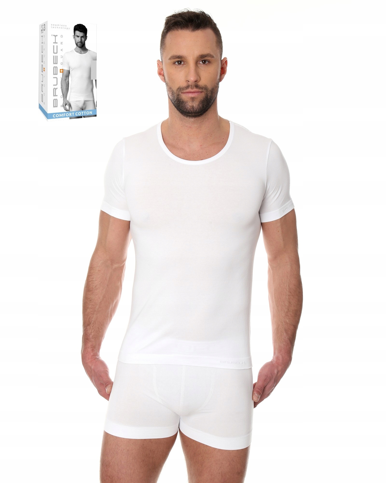 ЧОЛОВІЧА БЕЗШОВНА ФУТБОЛКА BRUBECK COMFORT COTTON З КОРОТКИМИ РУКАВАМИ - бавовняні футболки, трусики та штани від Brubeck виготовляються на сучасному обладнанні. Вироби не крояться «старими» методами з бруса матеріалу і потім зшиваються швачками, а створюються у вигляді рукава, після чого рукава і штанини пришиваються ПЛОСКИМ ШВОМ . Такий спосіб виробництва означає, що ВІДСУТНІСТЬ БОКОВИХ ШВІВ з одного боку, нижня білизнаНЕПОМІТНА ПІД ОДЯГОМ, а з іншого боку, НЕ ВІДКРИВАЄТЬСЯ ШКІРИ у найбільш чутливих місцях