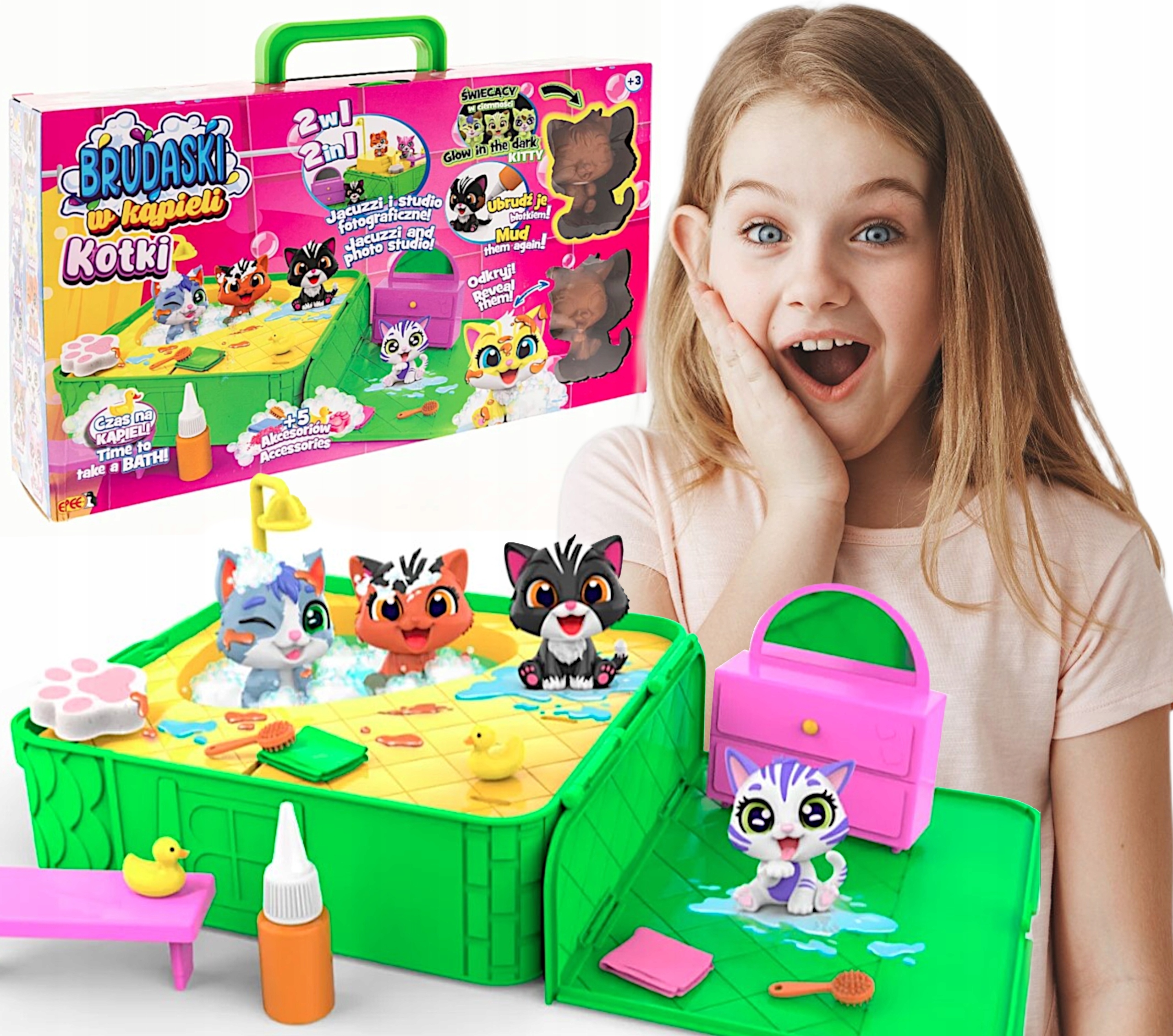 Набір джакузі дозволяє мити котів у джакузі та грати у фотостудії. елементи джакузі та фотостудії укладені в зручну валізу. Крім того, один кошеня з набору світить у темряві!