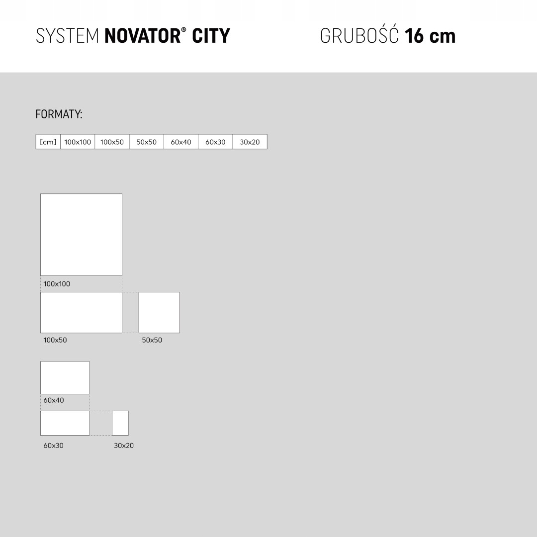 Novator City® -це серія великих панелей бруківки, які доповнюють колекцію Novator®. CDS, доступні в товщинах 8, 12 та 16 см, можуть успішно прикрасити міські квадрати та простір навколо громадських будівель, що дозволяє здійснити колісний рух будь -якого навантаження.