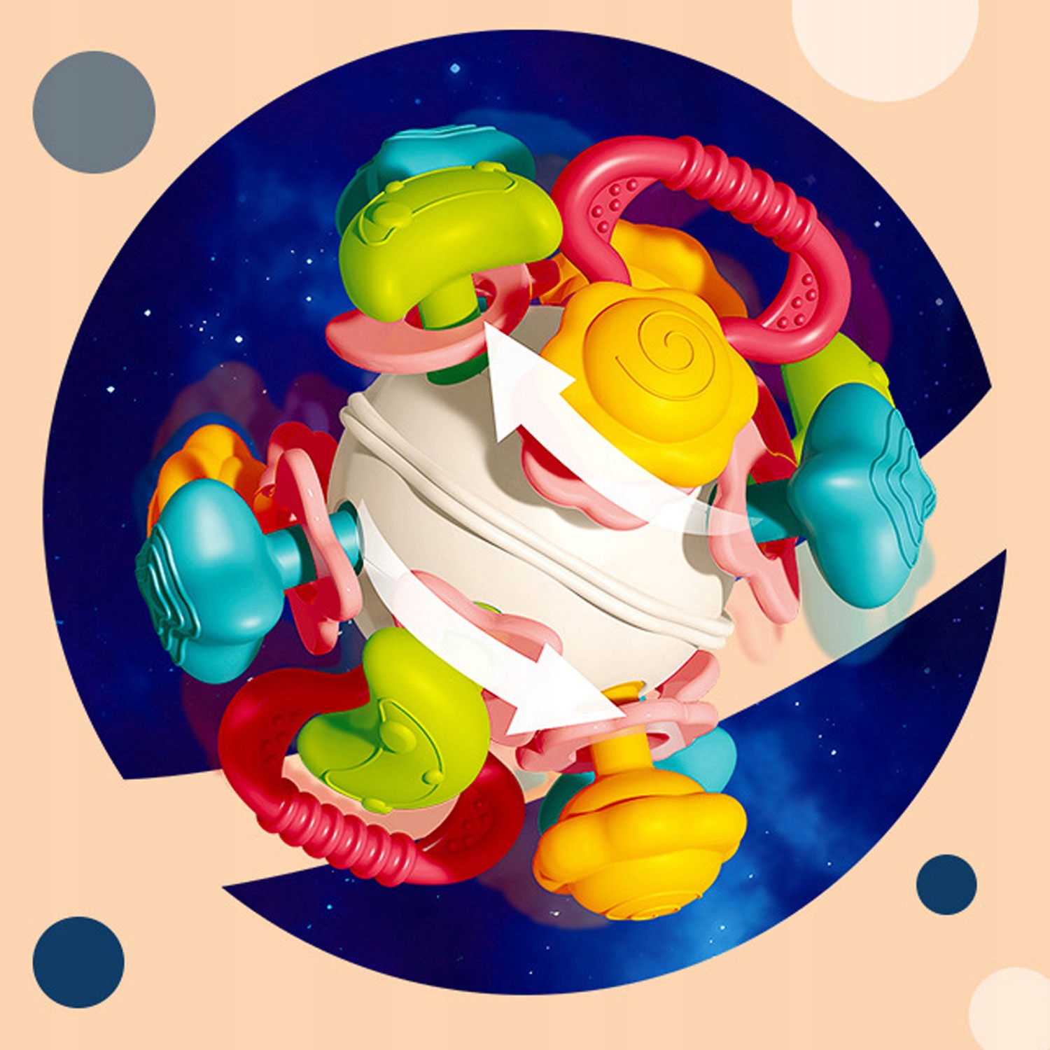 Кольоровий 2- брязкальце in-1у формі кульки, це ідеальна іграшка для самих маленьких. Він був наповнений маленькими намистинами та створений з думкою про дітей. Його форма та розмір були адаптовані до навичок і потреб дітей. Кожне з кіл прорізувача можна обертати, що викликає характерний звук «клац-клак». Ручки прорізувача виготовлені з гуми, що гарантує комфорт під час гри.