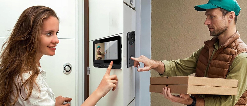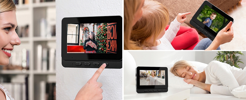 - 🔔Екран 4,3 дюйма та широкий кут огляду 120° забезпечує чіткіше зображення, онлайн-моніторинг і відеодомофон в режимі реального часу.
