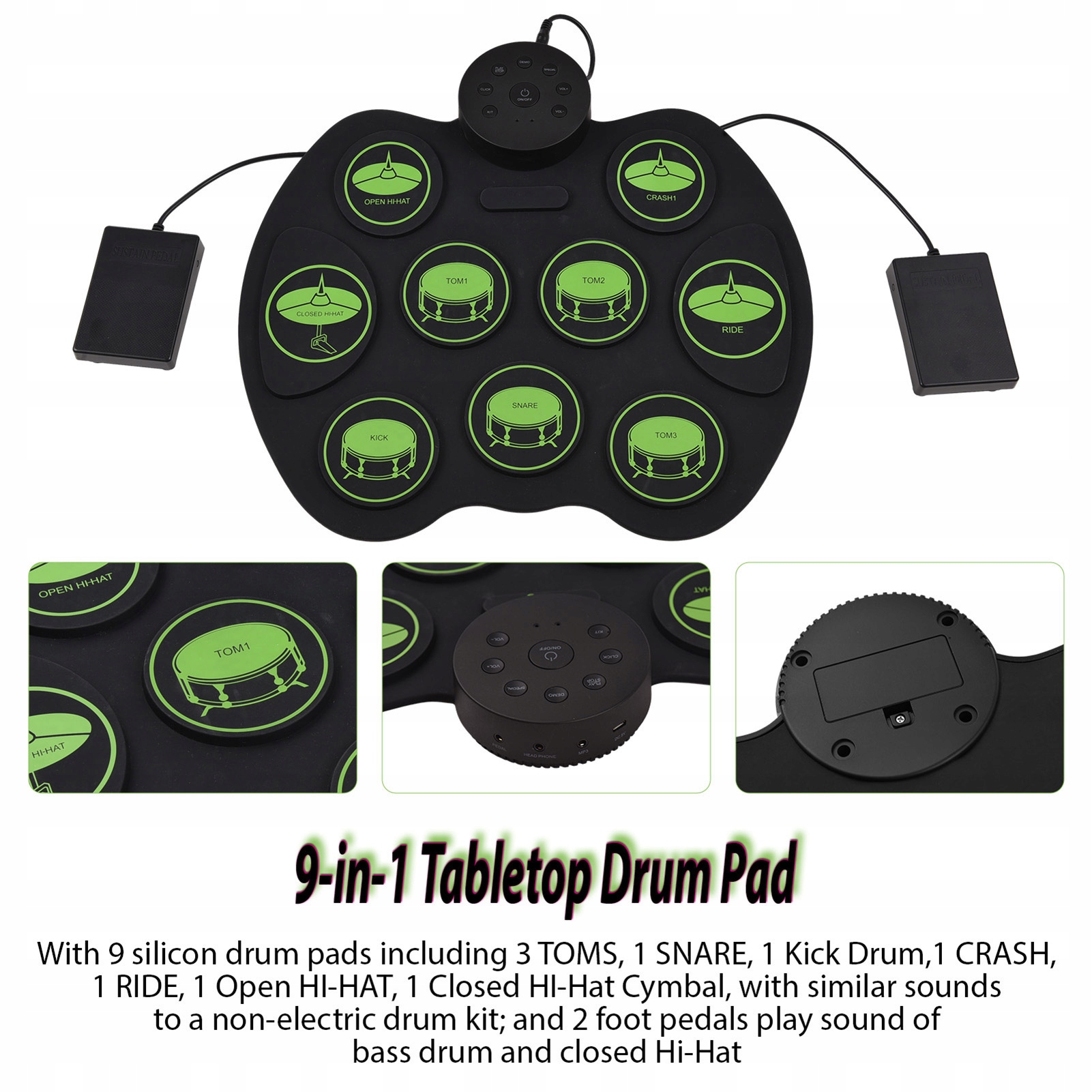 2. 【9-в-1 настільний барабанний майданчик】 з 9 силіконовими барабанними колодками, включаючи 3 томи, 1 барабан, 1 удар барабана, 1 невдача, 1 їзда, 1 відкрита шапочка, 1 закрита тарілка Hi-Hat, з аналогічними звуками до неелектричного барабанного набору; і 2-футові педалі відтворюють звук басового барабана і закрито Hi-Hat.