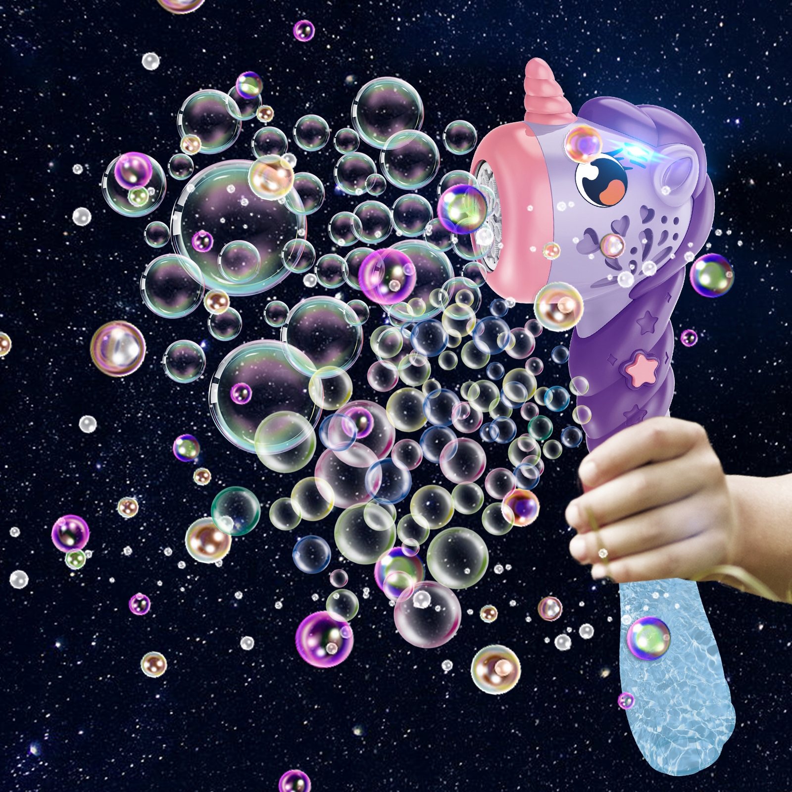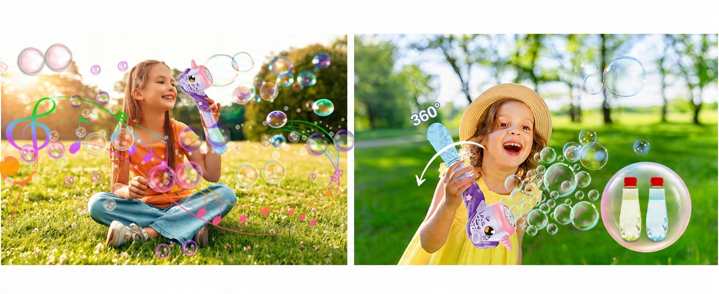 - Коли ви обережно вмикаєте вимикач, супроводжується музикою та світловими ефектами, видуваються різнокольорові маленькі бульбашки, не потрібно вручну занурювати рідину, насолоджуйтесь ваш час для вас!