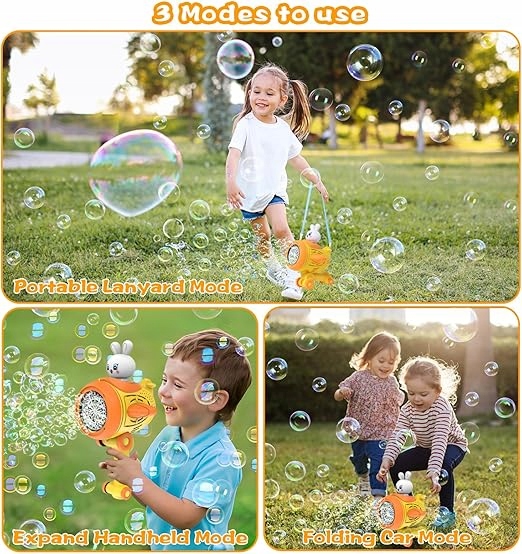 - пістолет для удару має форму унікальної коляски розкладної кролика. Включає 4 барвисті світлодіодні світильники, чарівну модель кролика з літальним апаратом та 4 розсувними колесами, які переміщують машину вперед завдяки бульбашкам повітря. Ці унікальні та сповнені характеру люблять діти з першого погляду. Універсальні режими веселощів розвивають уяву дітей і в той же час забезпечують гарну забаву