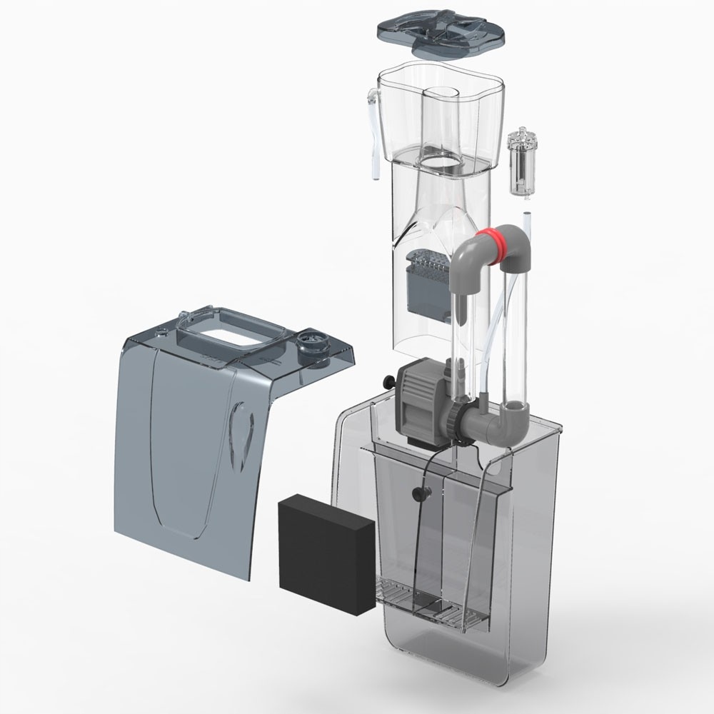 Завдяки встановленню на стінці резервуара очищати чашу для бруду та обслуговувати насос неймовірно просто. Скімер не потребує використання відстійника та не займає місця всередині основного резервуару.