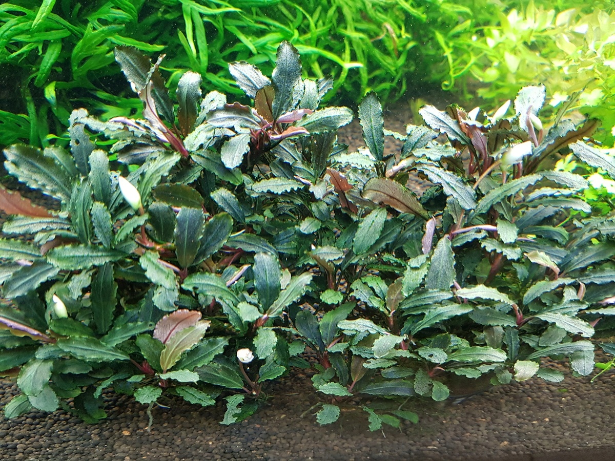 ОПИС: Буцефаландра темно-пурпурова - дуже красива рослина з зелено-фіолетовим листям. Характеризується унікальною формою і повільним зростанням, що дозволяє створювати красиві і довговічні композиції в акваріумах. Ідеально підходить для посадки коренів або каменів.