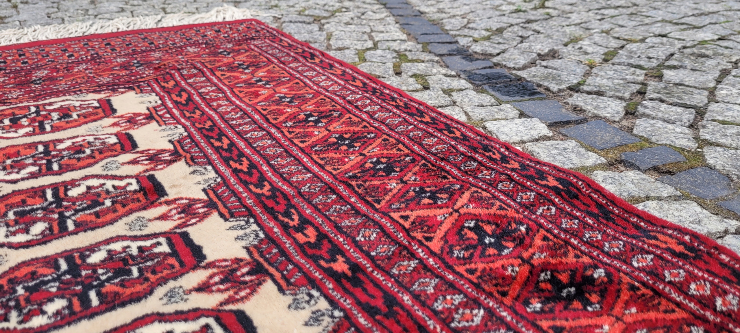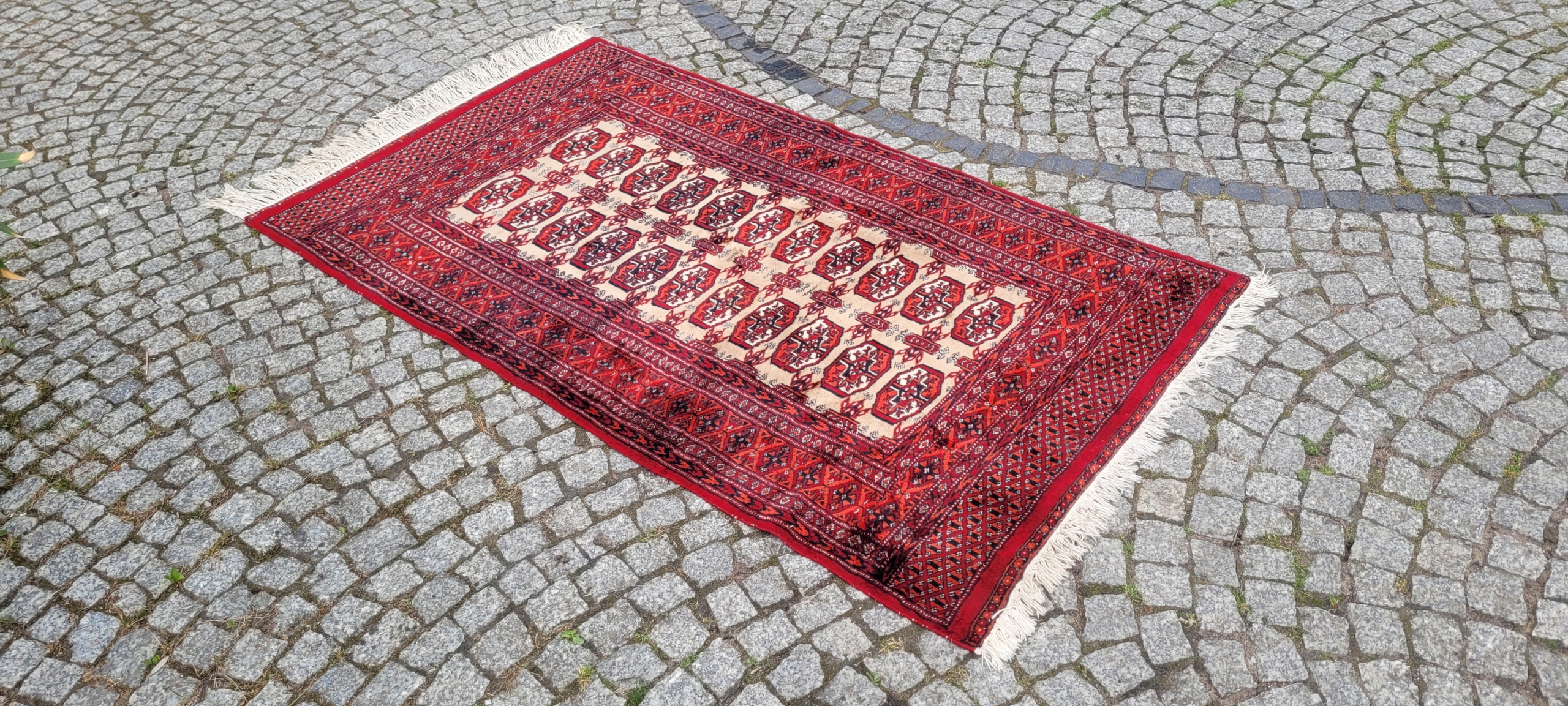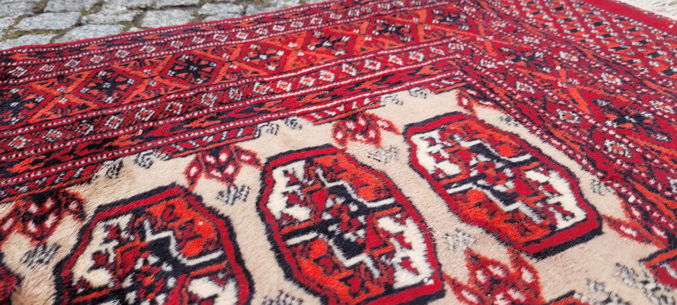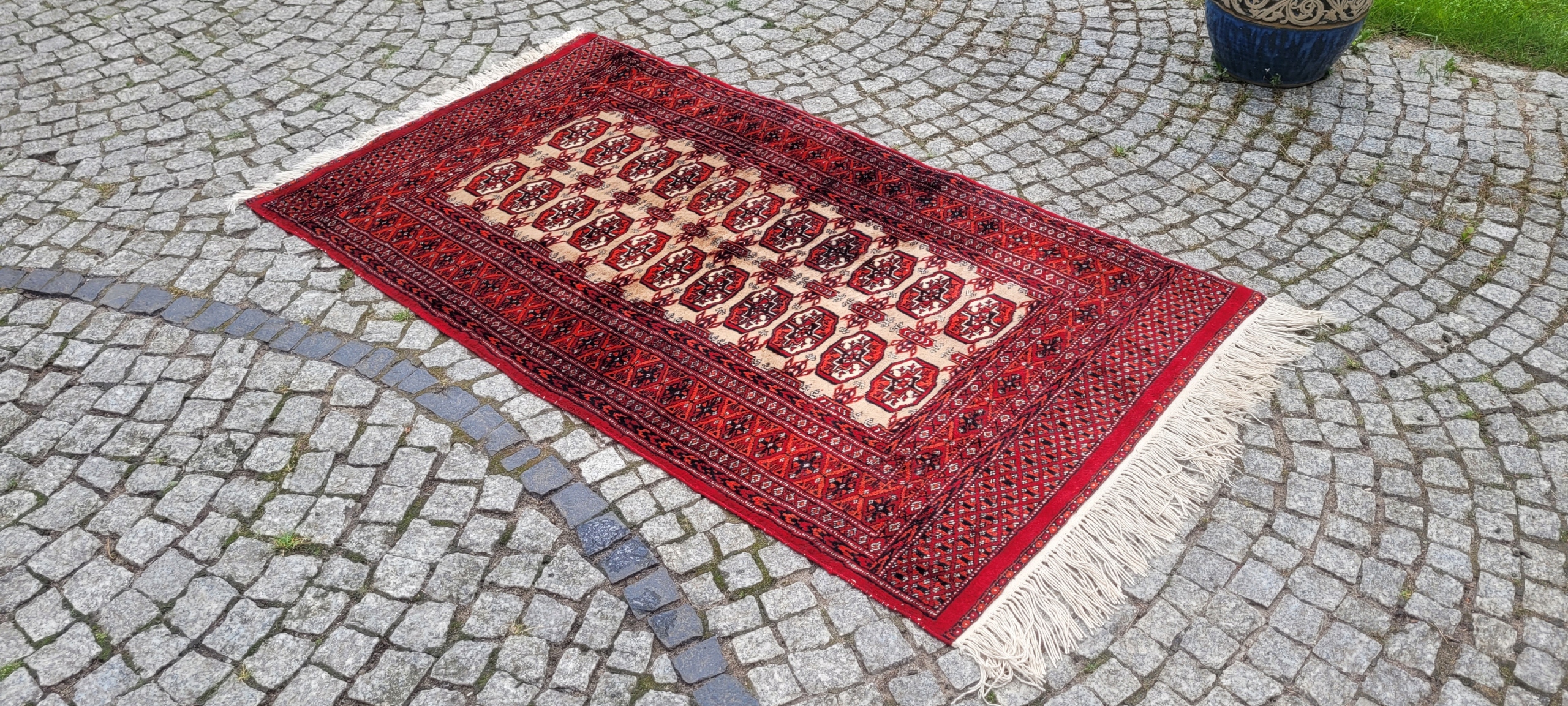 Східний бухарський килим. Виткана вручну з полірованої вовни найвищої якості. Характеризується компактним, приємним на дотик флісом і красивими кольорами та візерунками. У хорошому стані, видно на фото.