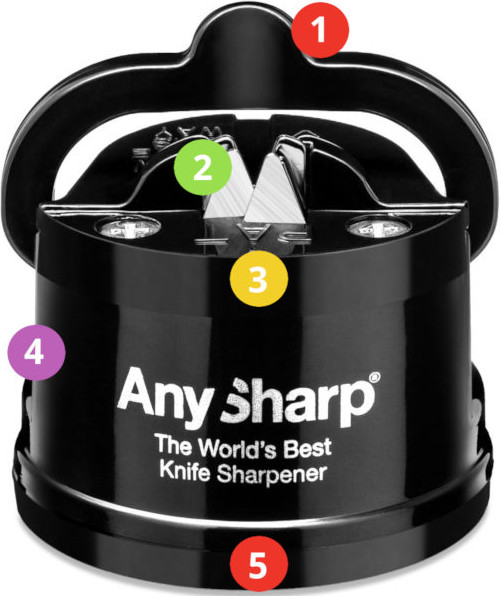 Секрет точила AnySharp® полягає в двох трикутних заточувальних пластинах, повністю виготовлених із надтвердогокарбіду вольфраму. Це сучасний, технологічно прогресивний матеріал, який створюється в результаті синтезу металевого вольфраму та вуглецю при високих температурах, до 2000 °C.