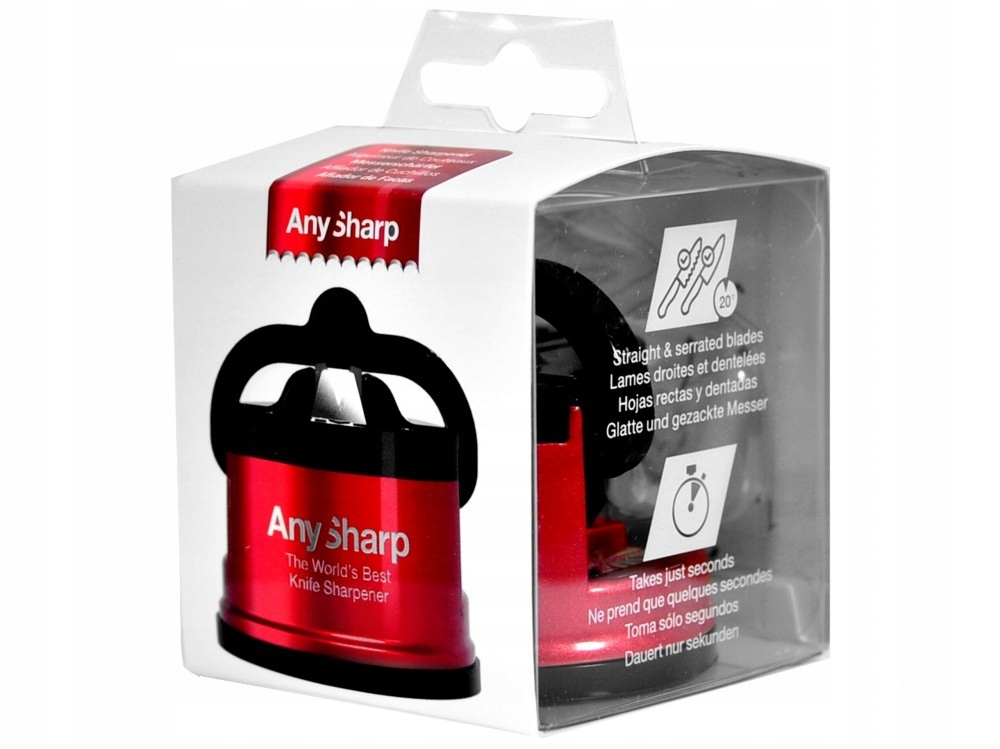 AnySharp Pro red — одна з найпростіших і найбільш універсальних точилок у світі, що дозволяє заточувати ножі з гладкими та зубчастими лезами.