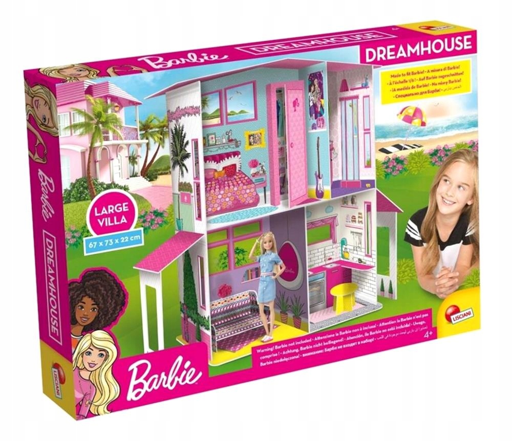 Величезна вілла Барбі, в якій можна розмістити навіть оригінальну ляльку Барбі! З цього набору ви можете зібрати тривимірний ляльковий будиночок розміром 73 x 67 x 22 см у складеному вигляді. Будинок двоповерховий, містить такі меблі, як шафа, диван і садові аксесуари - шезлонги, стіл і огорожу з квітами. Набір виготовлений з високоякісного картону.