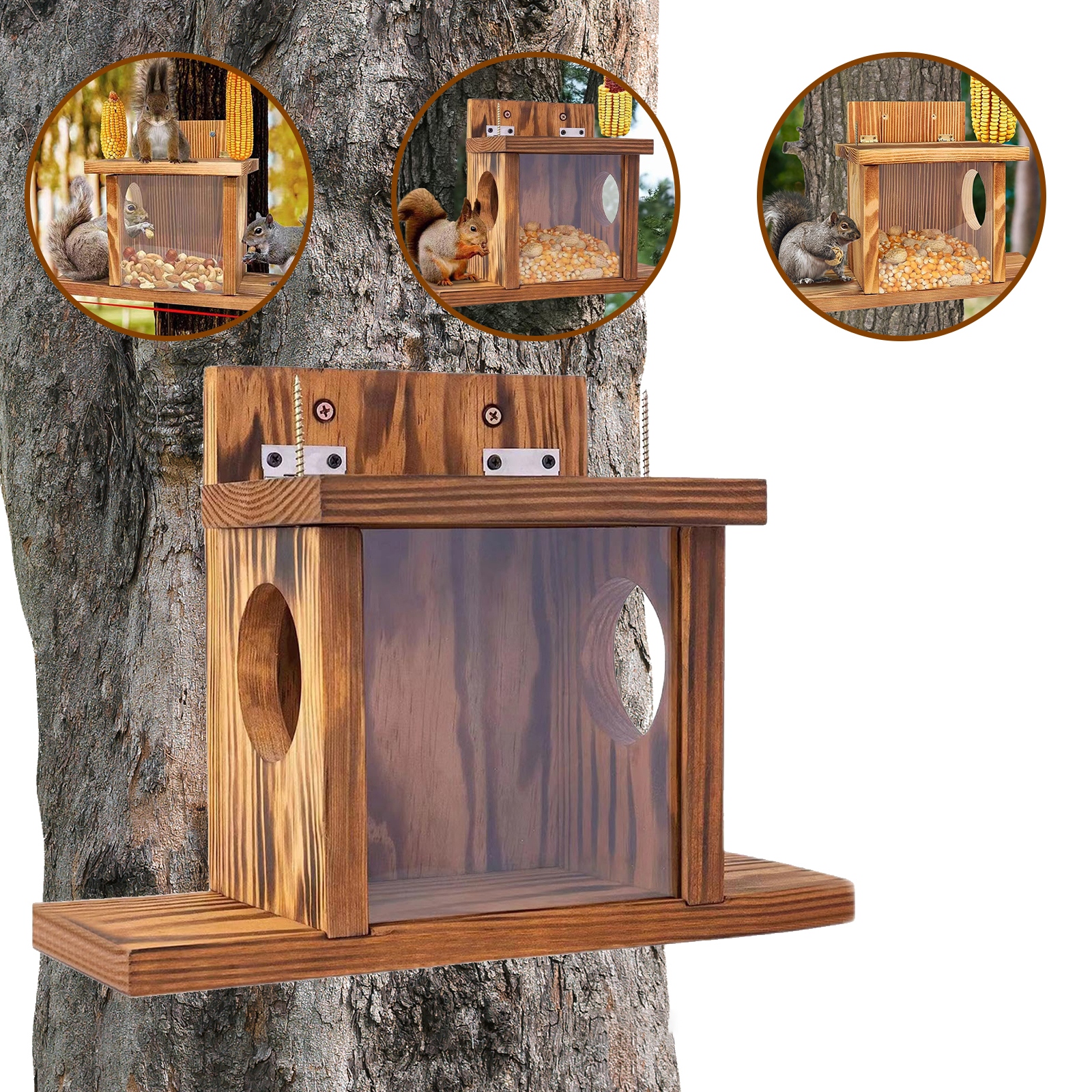 Цей годівниця для білок виготовлена з міцної деревини і має суцільну верхівку. Конструкція дуже стабільна. Він стійкий до вітру та дощу, тому ви можете легко доповнити їжу, не боячись її отримати.