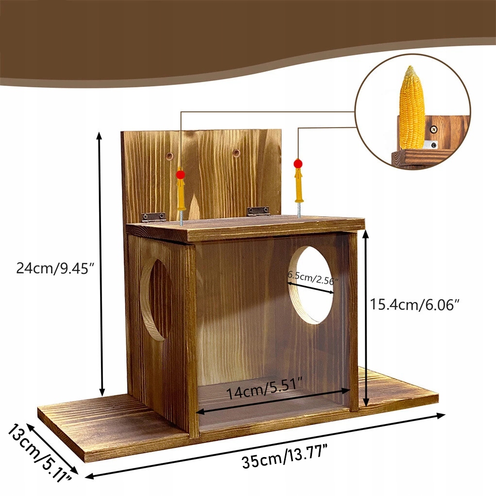 Годівниця для білок прикріплена двома дерев'яними кілками. Легка збірка: просто прикрутіть стіл до дерева або паркану та прикрутіть качани кукурудзи до тримача. Розміри: висота 24 см, ширина 13 см, довжина 35 см.