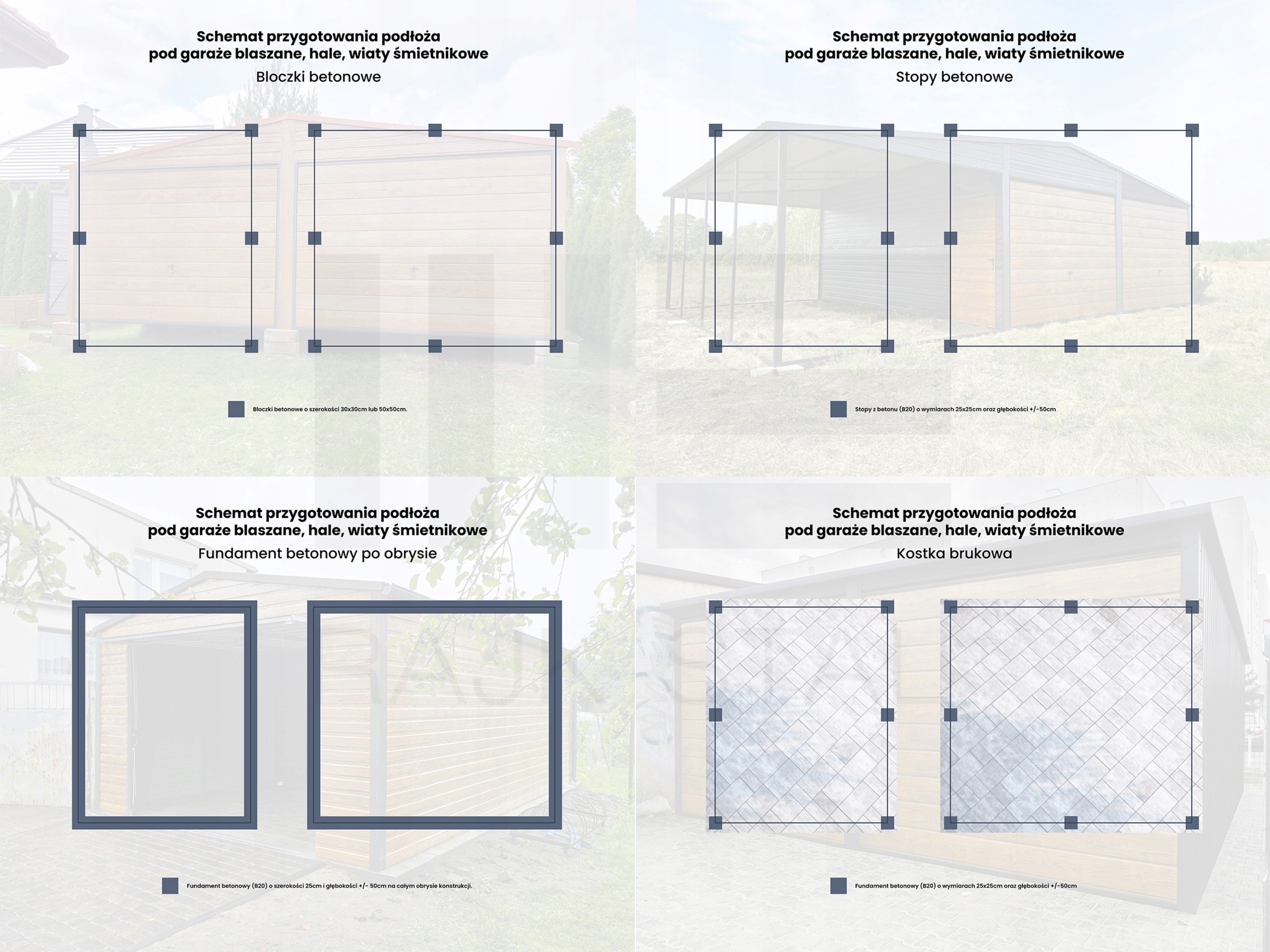 Бетонний фундамент – одне з найдовговічніших рішень. Рекомендується для великих і важких конструкцій, таких як гаражі з листового металу з кількома станціями або холи.