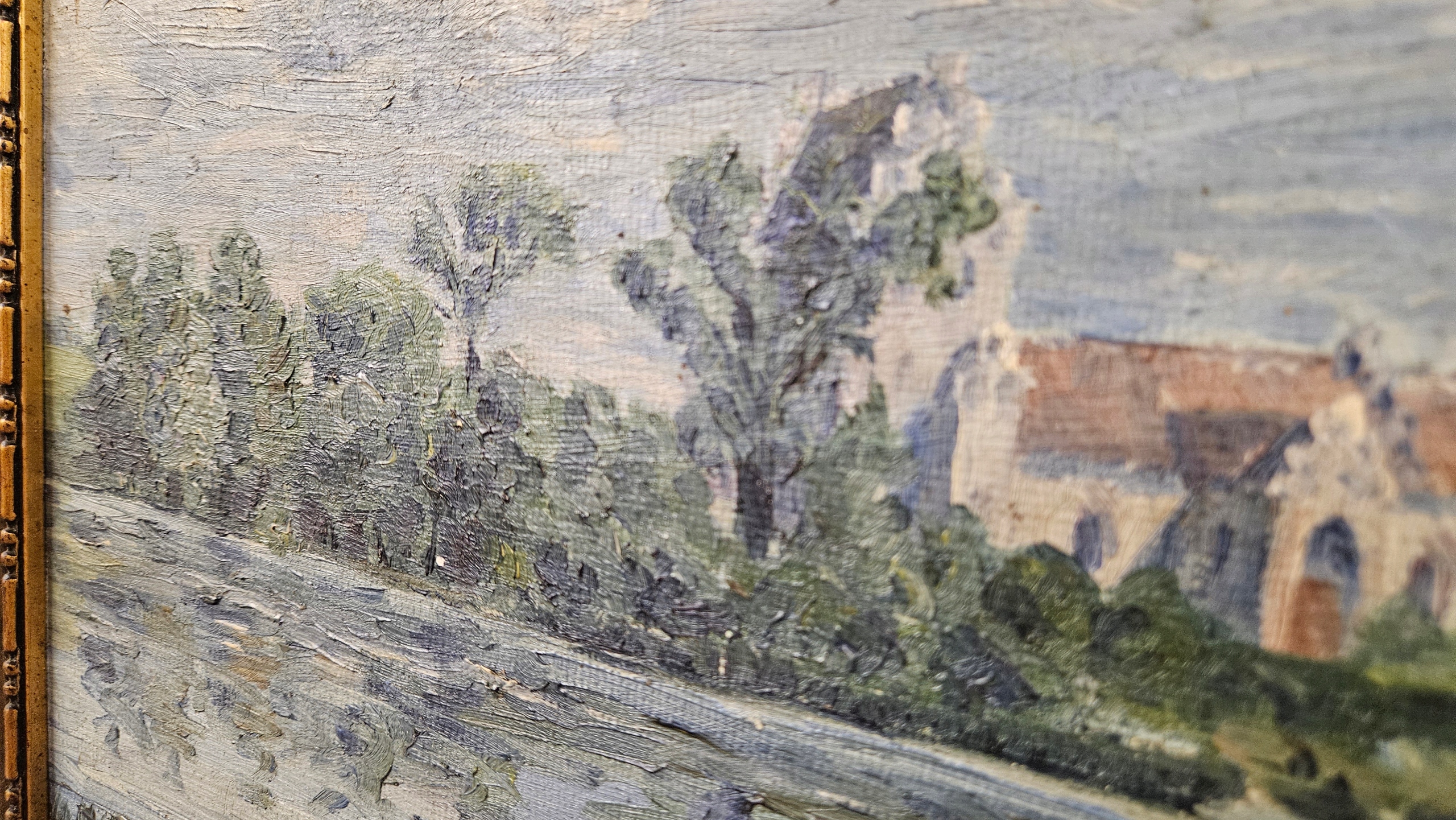 Тема аукціону - це прекрасна стара картина нафти на альбомі, що зображує пейзаж на річці. Зображення, зроблене на малюнковому тарілці, з технікою імпасти. Видимий Краків. Аверс має підпис автора.