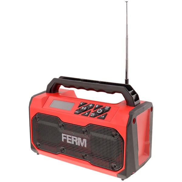 Це бездротове радіо для будівельних майданчиків від FERM ідеально підходить для прослуховування музики під час виконання будь-якої роботи. Слухайте будь-яку радіостанцію або грайте власні пісні через Bluetooth. Компактний розмір і практична ручка дозволяють брати його куди завгодно. Крім того, USB-вхід дозволяє легко заряджати телефон або інший мобільний пристрій. Радіо працює від акумулятора AXE 20 В.
