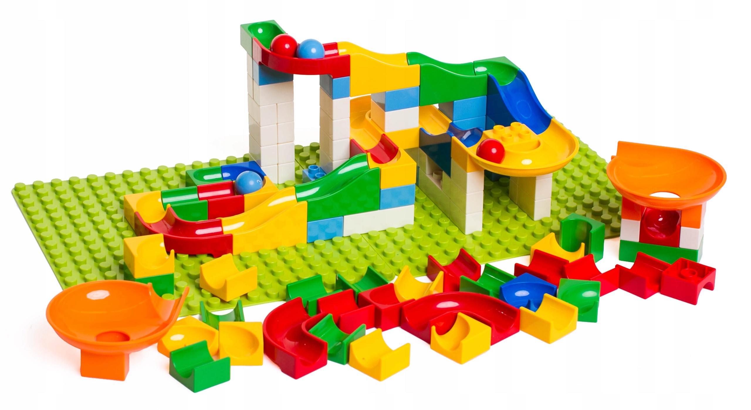 Чудовий набір, який поєднує в собі переваги двох дуже популярних іграшок: традиційні кубики "цеглинки" та м'ячева доріжка (м'яч трек) .