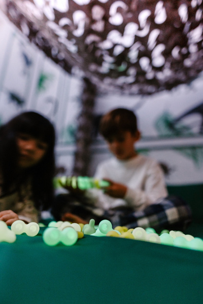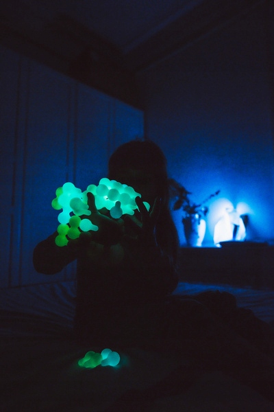 Створюйте лампи будь-якої форми: коня, квітки, вежі та багато-багато іншого. Більше 500 можливостей побудови різноманітних візерунків. Набір містить елементи зі спеціальними люмінесцентними пігментами, які збирають світло та повільно виділяють його в темряві. Виставте ці предмети на денне світло на 1-3 хвилини, щоб вони почали світитися. Пігменти абсолютно нешкідливі.