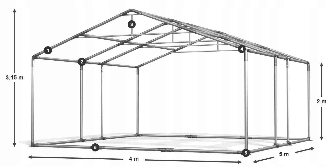 1 - Конструкційні труби fi прибл. 38 мм 2 - Роз'єми конструкції fi прибл. 42 мм 3 - Посилена конструкція даху 4 - Міцні гвинти проходять через 5 - Ніжка fi 9 см 6 - Посилена конструкція підлоги