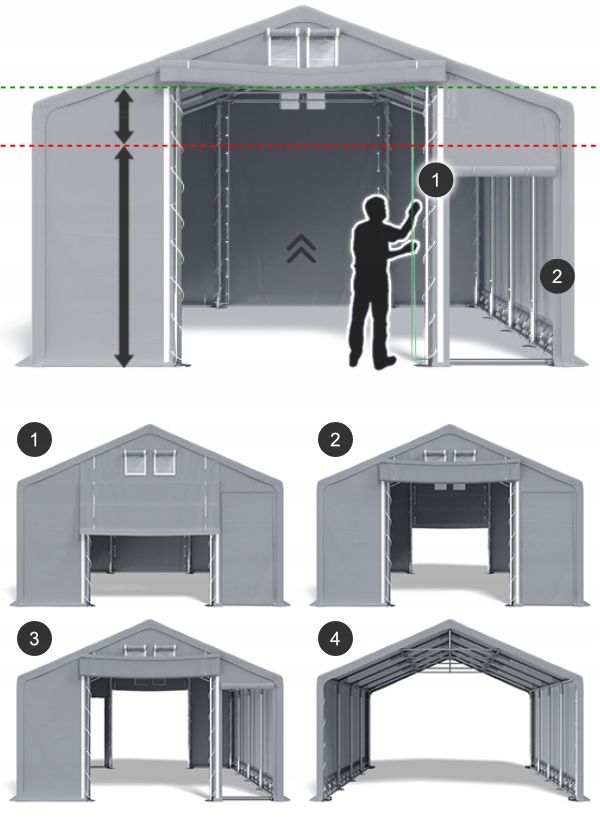 Модульна конструкція дозволяє легко збільшувати або зменшувати висоту намету. Для цього використовується додатковий підйомний комплект у вигляді міцних сталевих труб довжиною 0,5м або 1м.